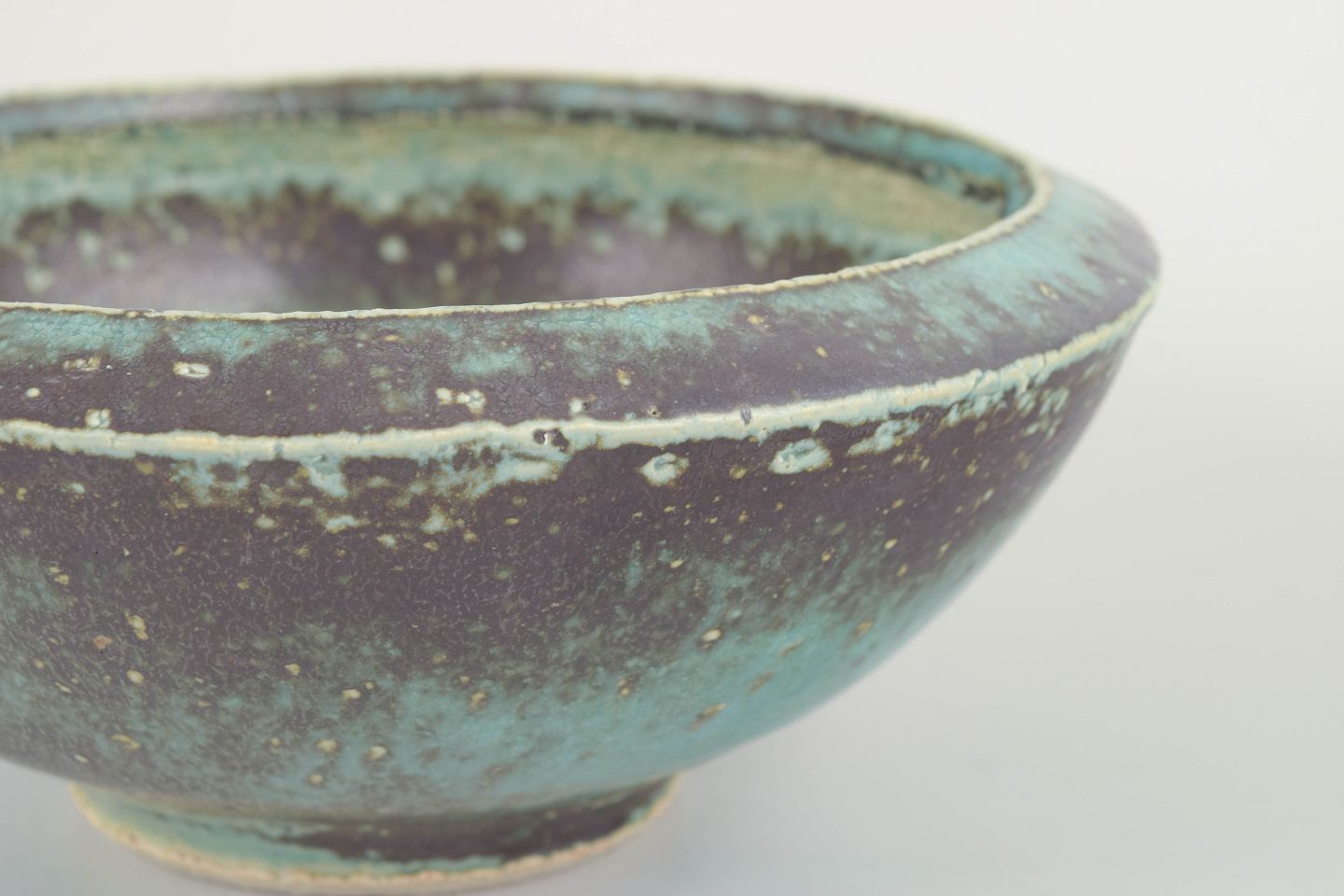Hånddrejet stentøjsskål med bred, afrundet kant og levende blågrøn glasur over mørk brunlig bund.