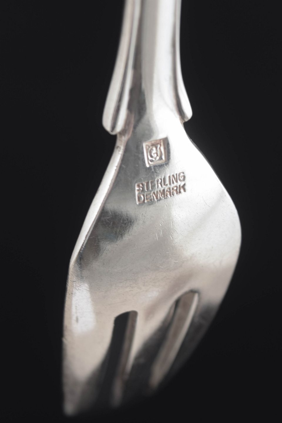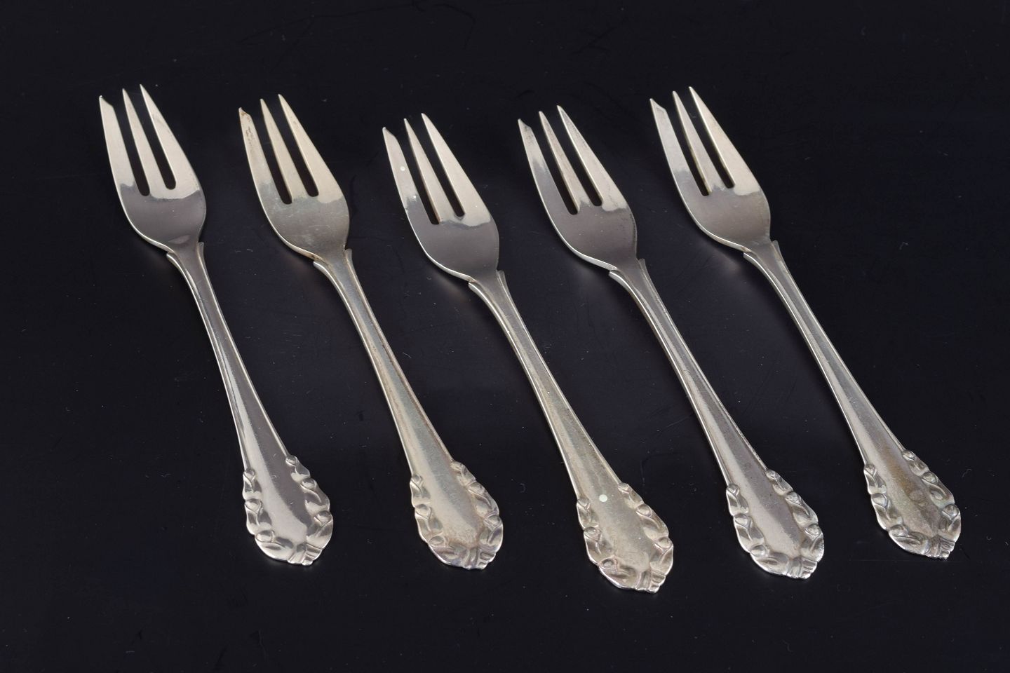 Sæt med fem kagegafler i sterlingsølv fra Georg Jensen i det klassiske “Liljekonval”-mønster. Elegant udført med afrundede linjer og blomsterornamentik i art deco-stil. Stemplet “GEORG JENSEN STERLING DENMARK”.