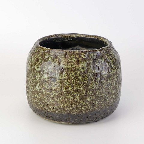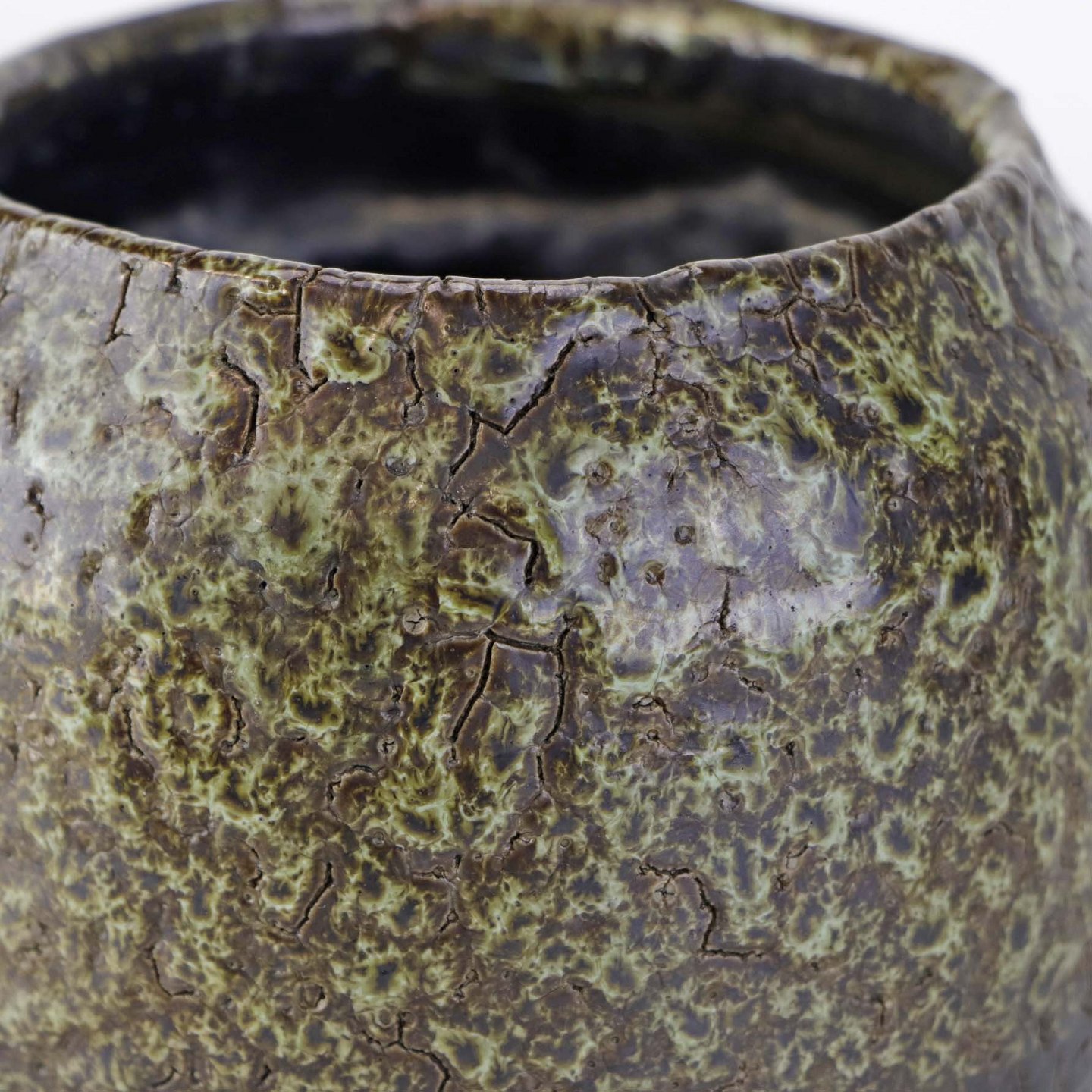 Skjuler til urtepotte i glaseret keramik med krakkeleret mønster i grønbrune farver.
