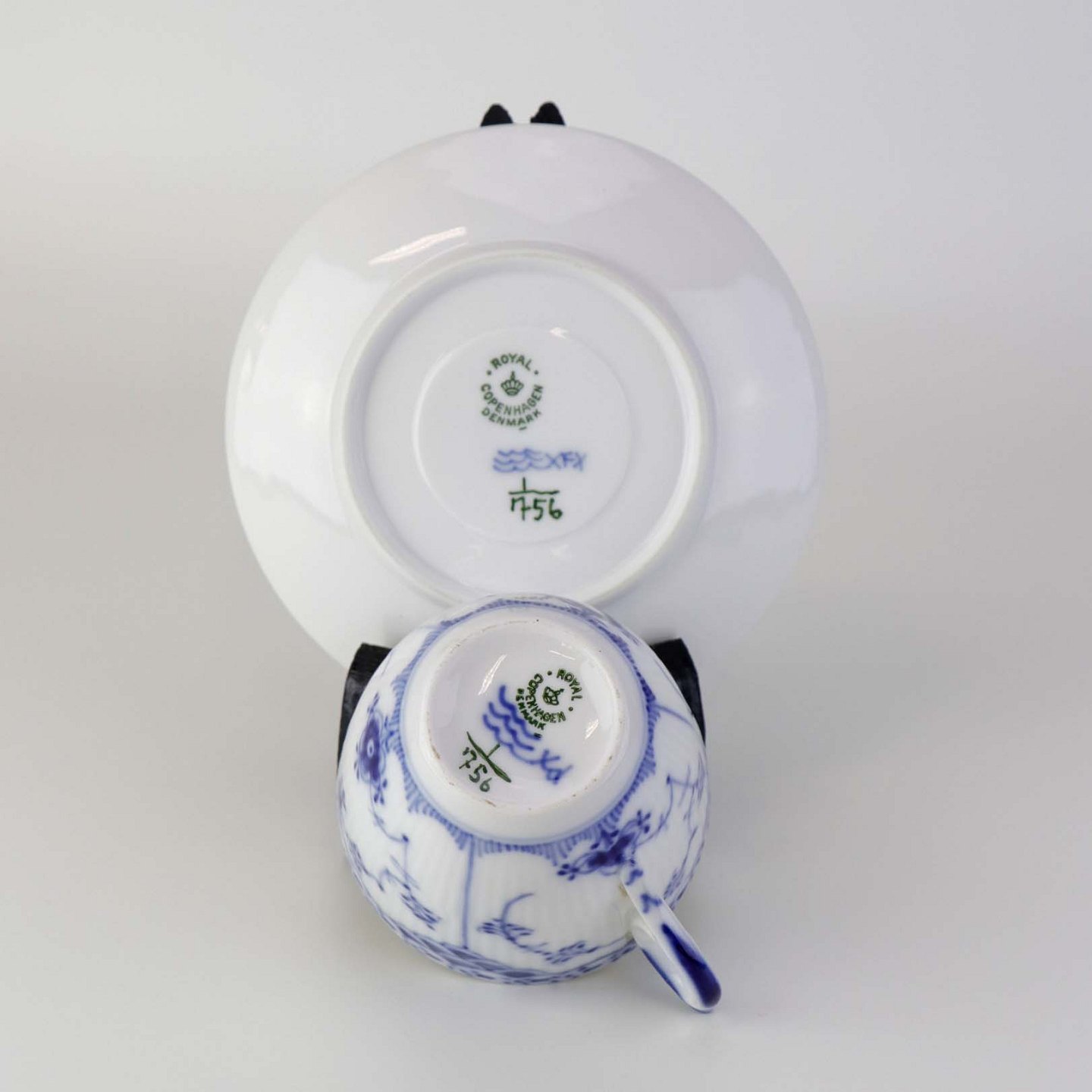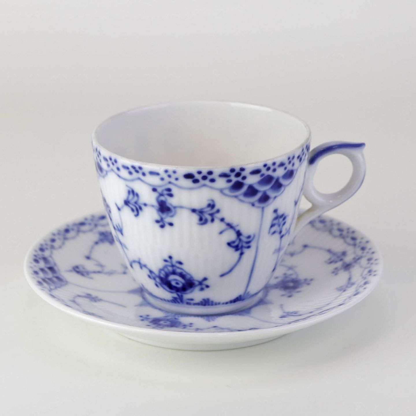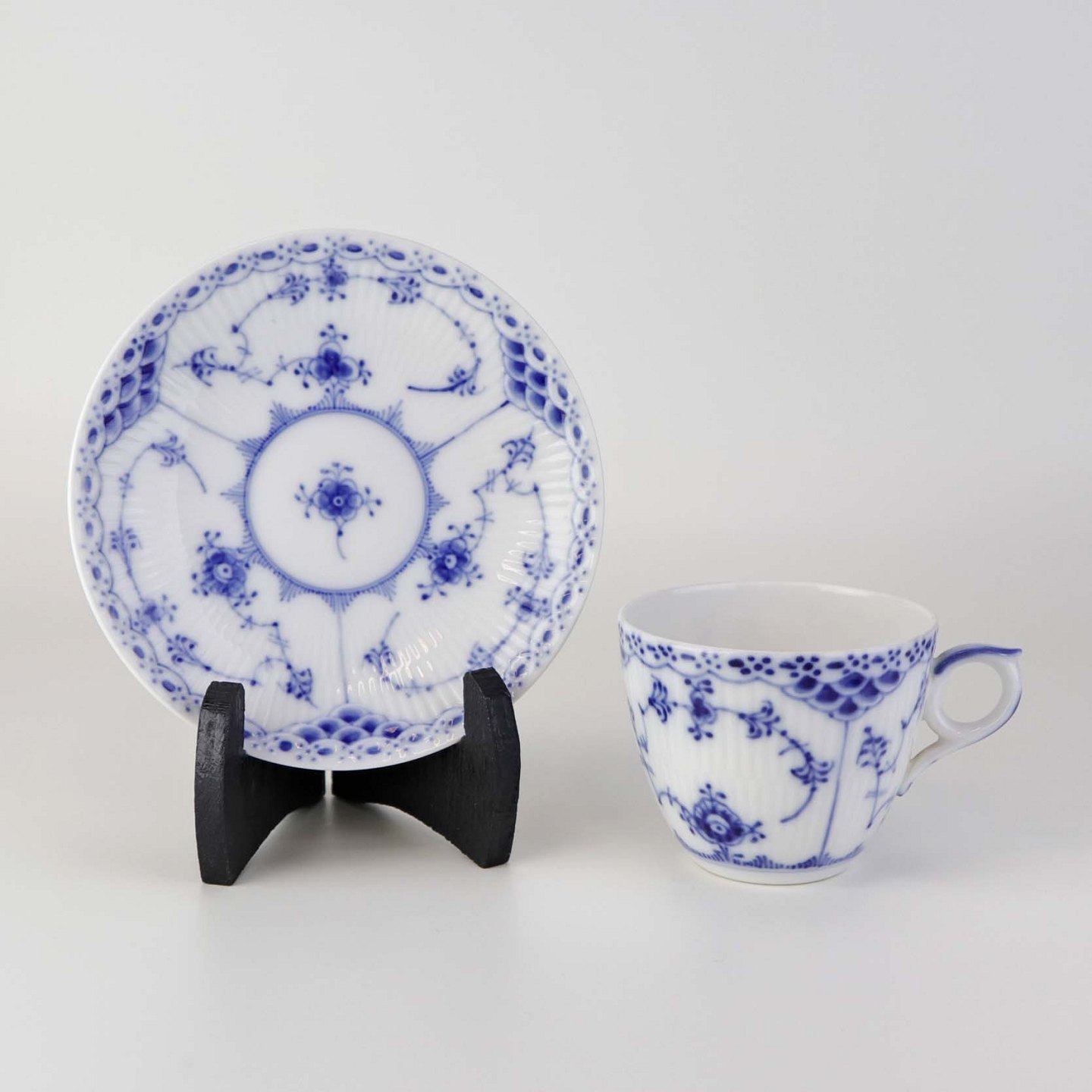 Stor kaffekop med underkop i kongeligt porcelæn fra stellet Musselmalet Halvblonde. Nr. 1/756
