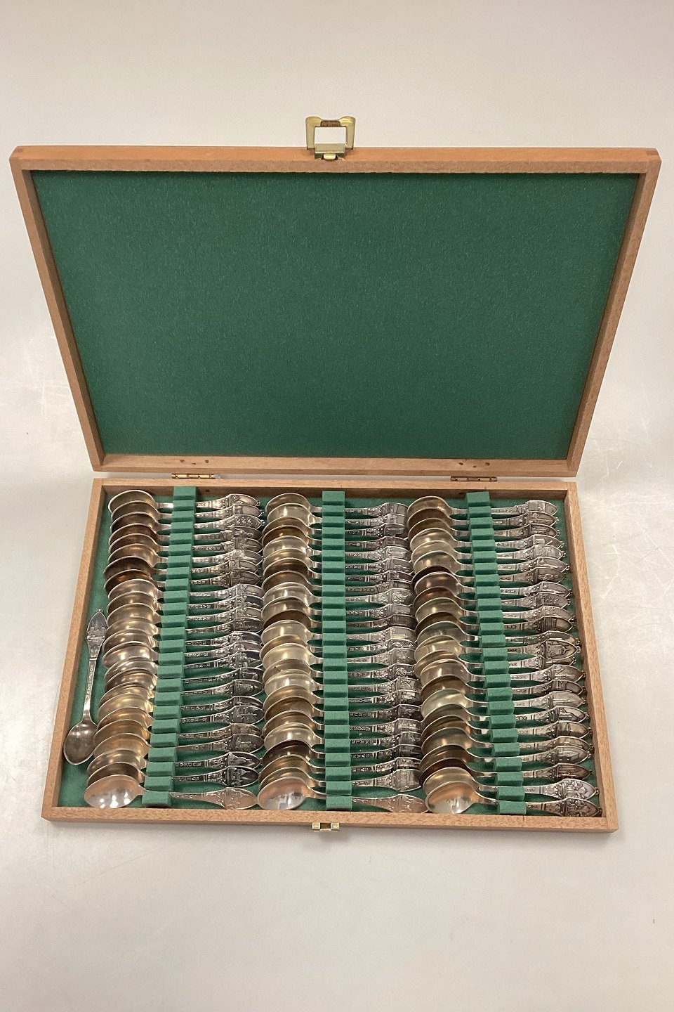 214 styk blandede skeer fra forskellige byer, samlet i 3 samlekasser i træ.