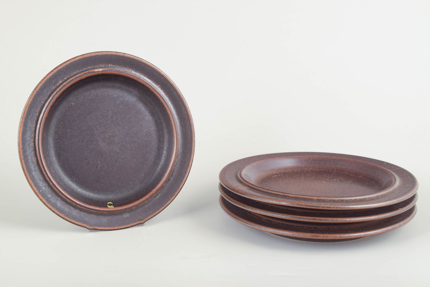 Fire mindre tallerkener i den ikoniske “Ruska”-serie, udført i mørkebrunt stentøj med den karakteristiske matte jernglasur, som varierer smukt i overfladens tone og struktur.