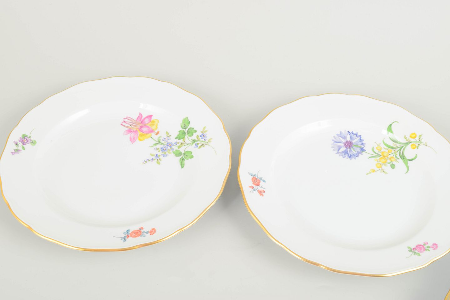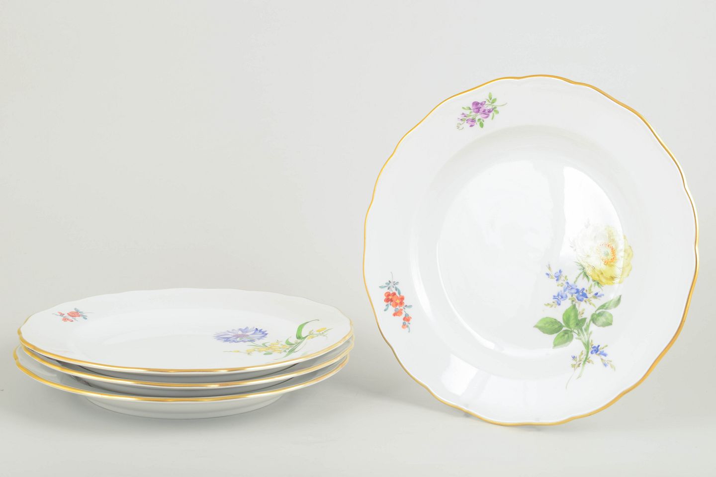 Fire antikke Meissen-tallerkener i porcelæn med håndmalede blomsterdekorationer og forgyldt kant. Klassisk form med svungen rand og detaljerede polykrome buketter, udført i den høje kvalitet Meissen er kendt for.