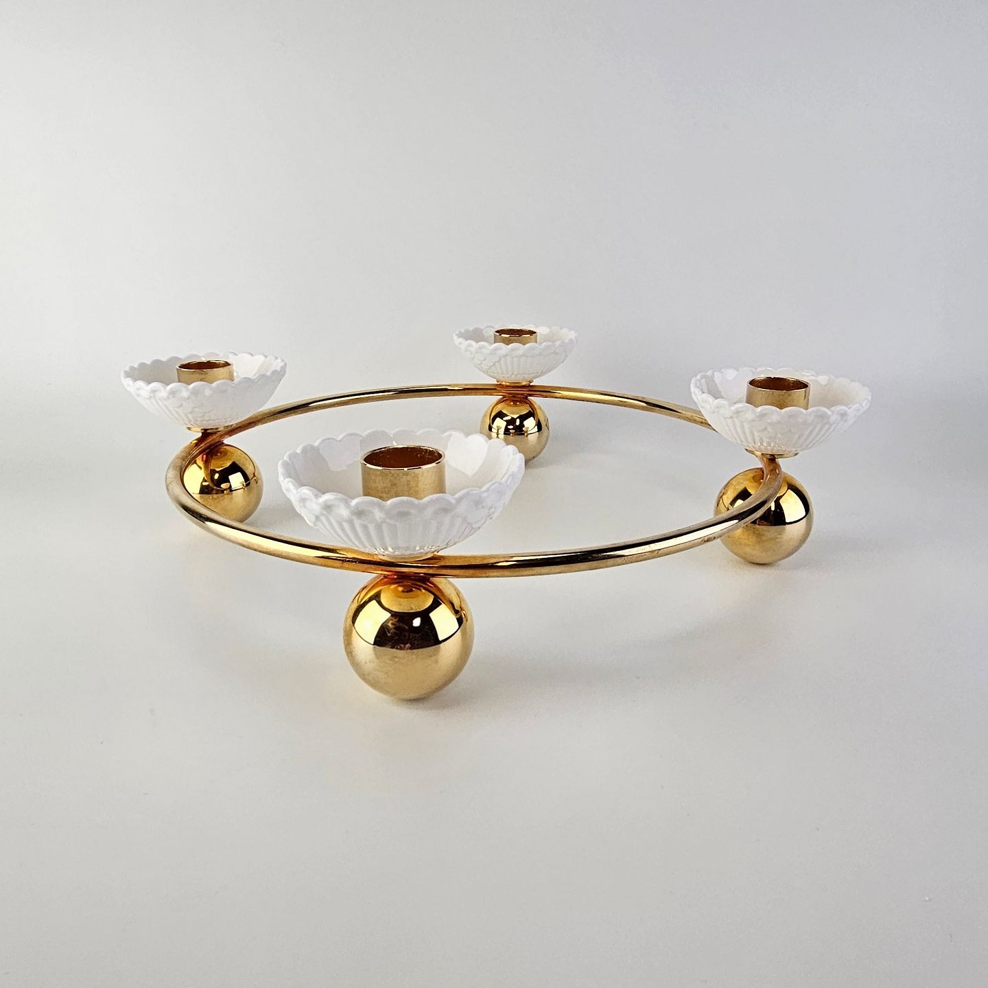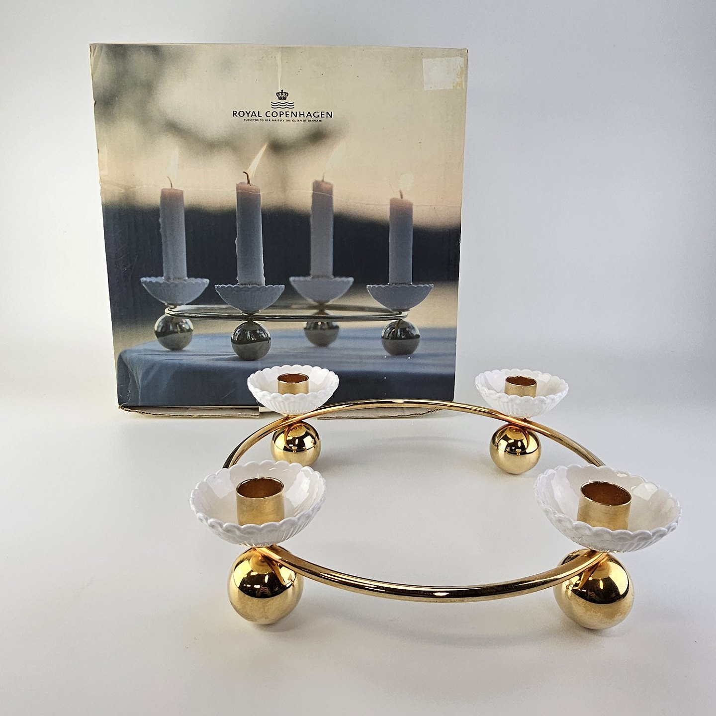 Rund lysestage i forgyldt messing med plads til fire lys i små hvide skåle af kongeligt porcelæn. Stagen er fra serien Creating Moments og kommer i original kasse