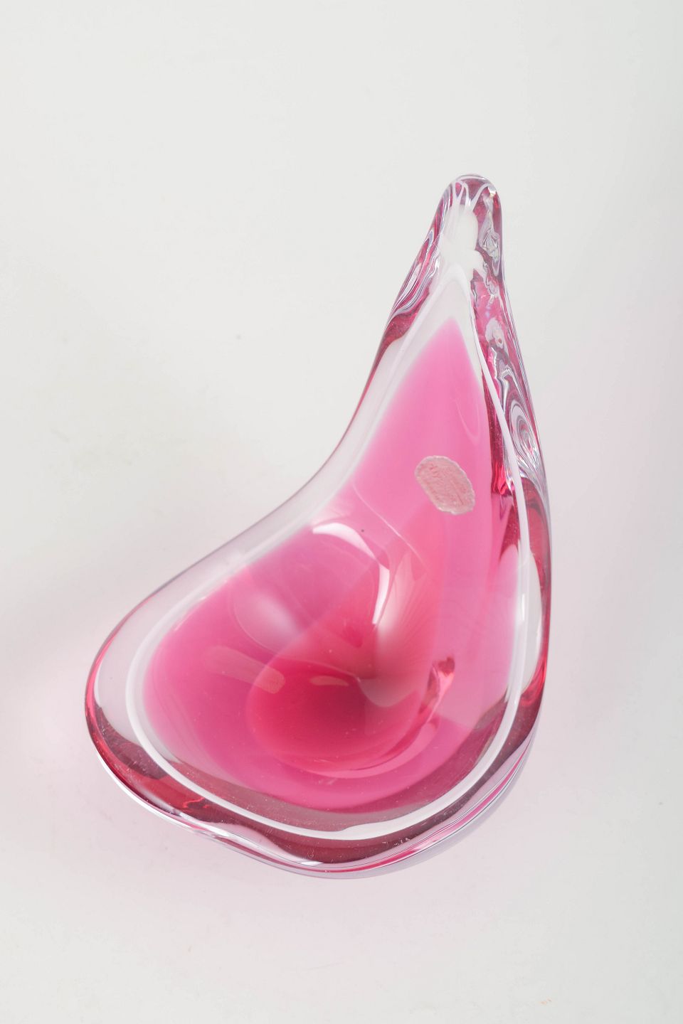Organisk formet kunstglas skål i klart glas med lag i rosa og hvid. Mundblæst med den karakteristiske svungne asymmetriske form fra Coquille-serien. Originalt Flygfors-mærke. Signeret.