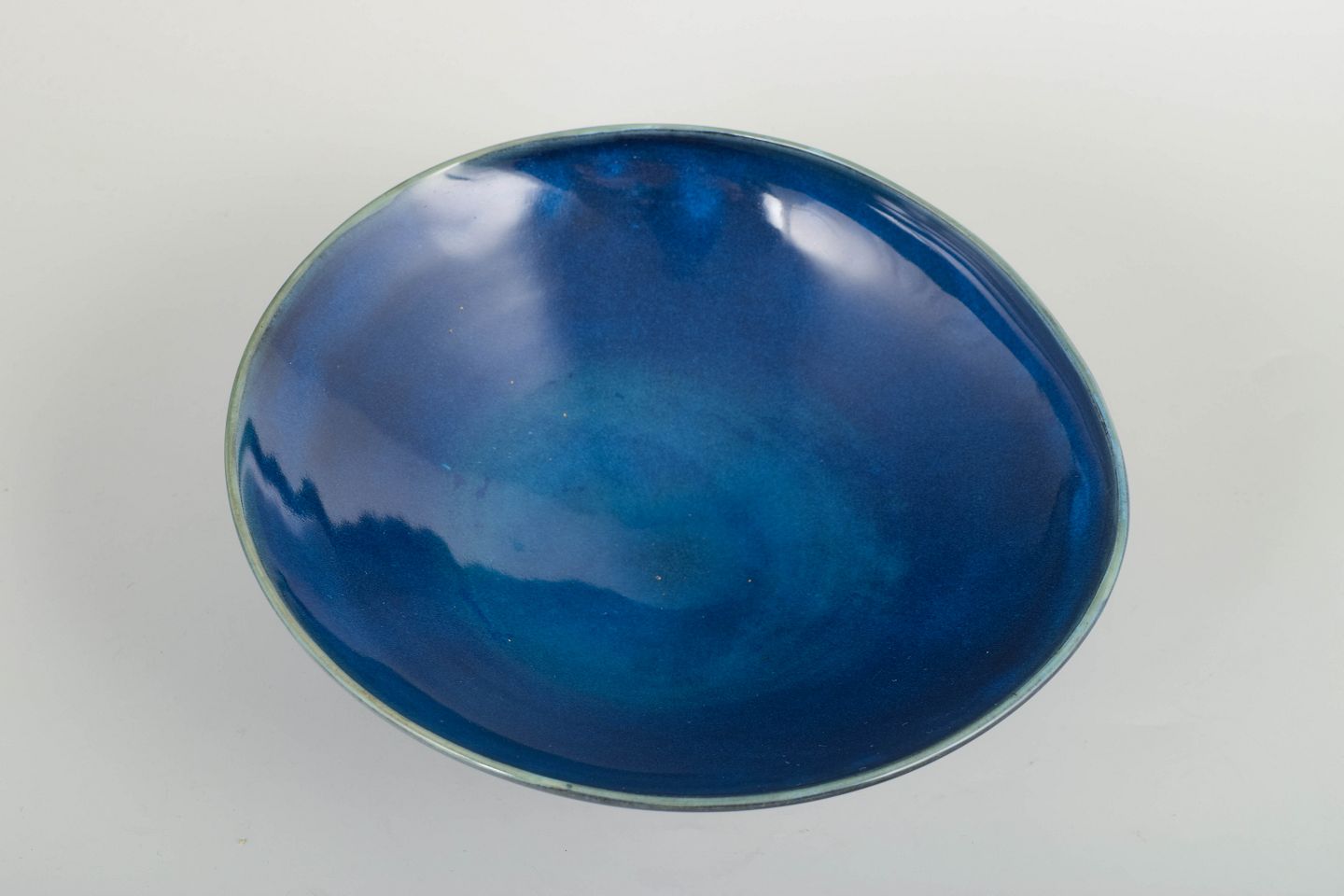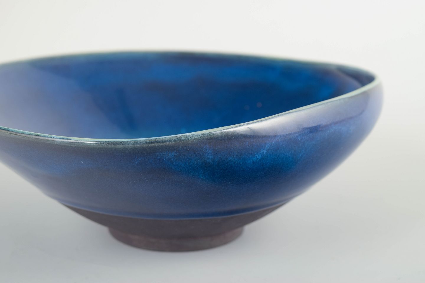Hånddrejet Farsta-skål i stentøj med dyb, intenst blå glasur og karakteristisk Farsta-fod i mørkbrændt gods. Et tidligt og sjældent studiearbejde fra Kåges eksperimenterende Farsta-produktion i 1930’erne.