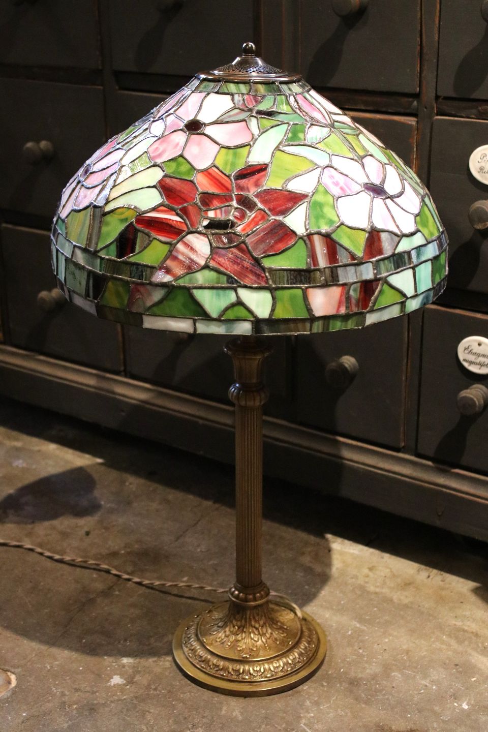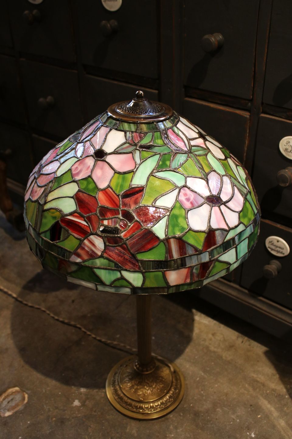 Dekorativ , gammel Tiffany bordlampe fra 40érne. med glasskærm i farvet blomstermotiv og fod i bronze. H: 75cm. Dia.: 42cm.
