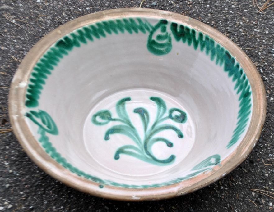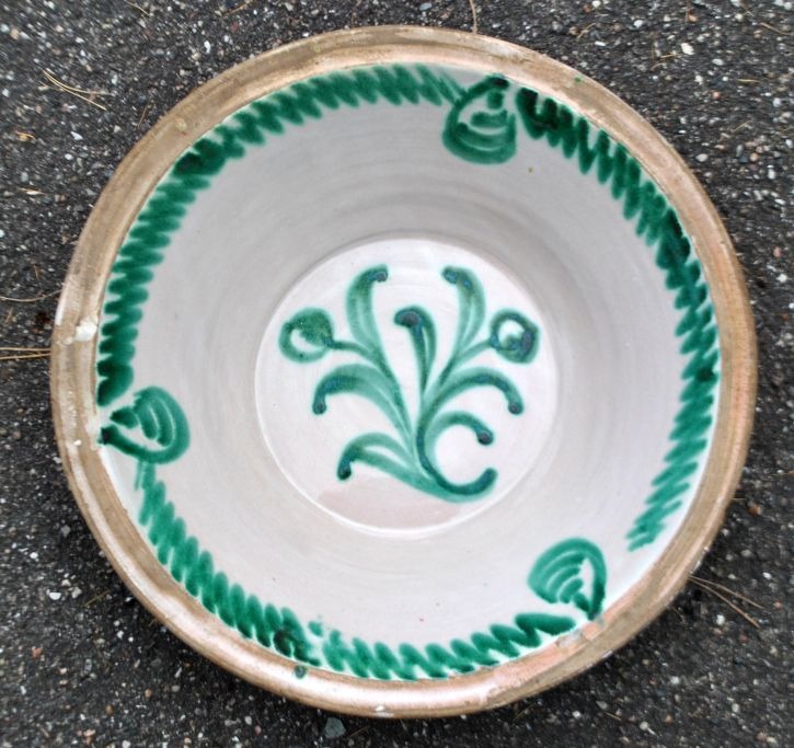 Stort antikt lerfad, 19. årh. Indvendig med grønne og lyse glasurer Med kantdekoration og midterdekoration i form af blomst. Dia.: 42 cm. H.: 12 cm.