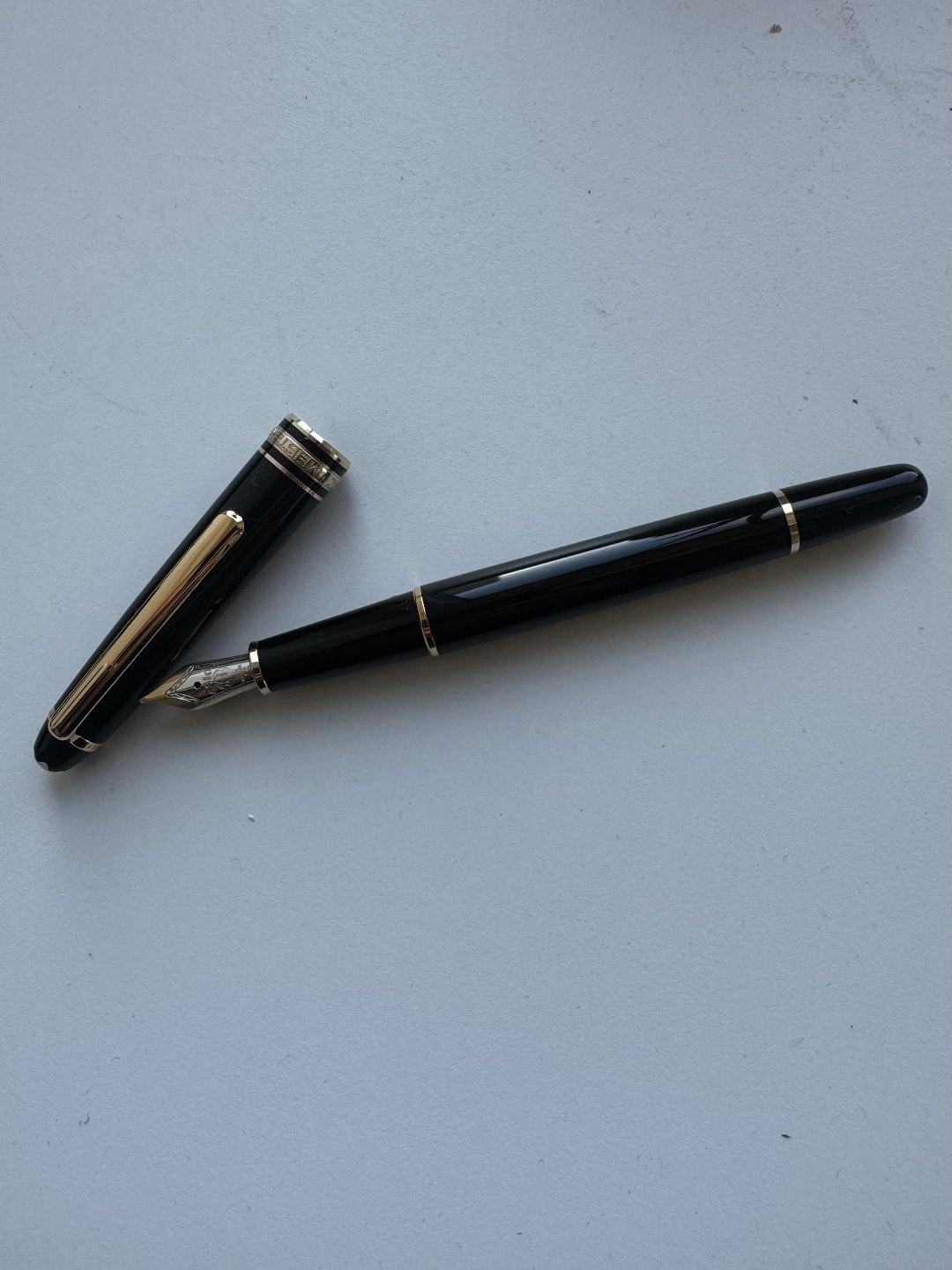 Nyere ubrugt sort Montblanc Classique Meisterstück fyldepen. Fremstår i perfekt stand. Alle dele originale til denne model inklusiv den elegante 18 karat’s to-farvede Montblanc guldspids i Medium størrelse (se label på fyldepennen). Original æske samt instruktionsbog medfølger.