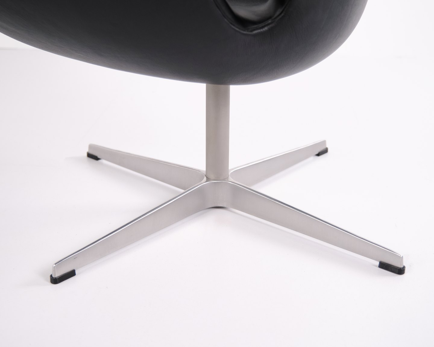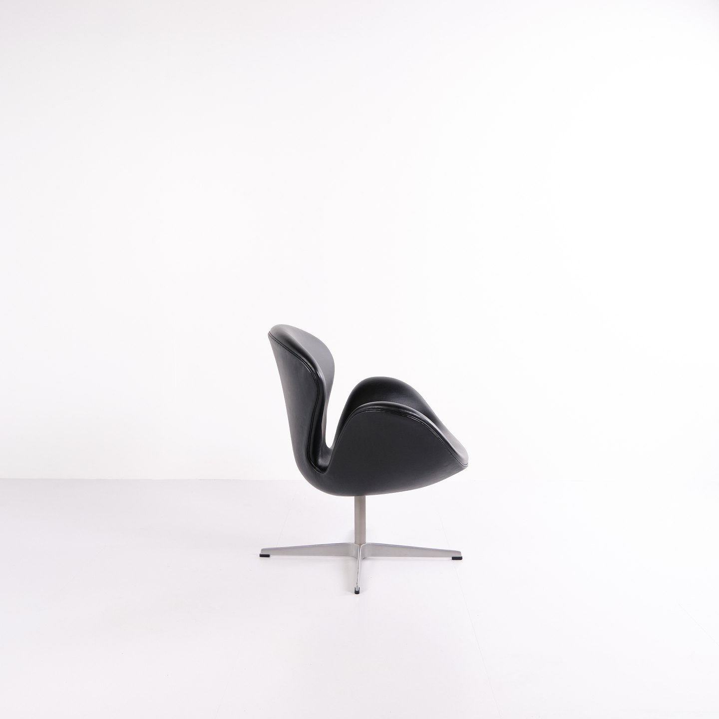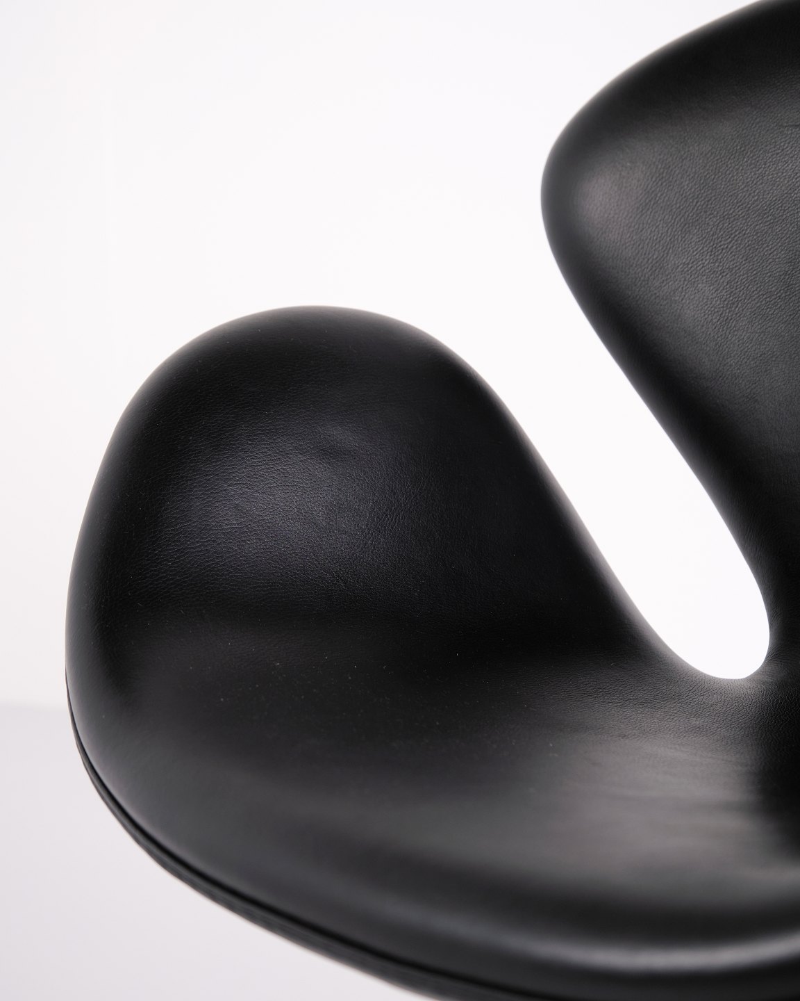 Svane stol designet af Arne Jacobsen og fremstillet af Fritz Hansen i 2002. Udført i sort Elegance læder, som er en højkvalitets anilinlæder med smuk dybde og naturlig struktur. Modellen er en videreførelse af Jacobsens originale design fra 1958 og produceret i Danmark med samme håndværksstandard som de tidlige udgaver.