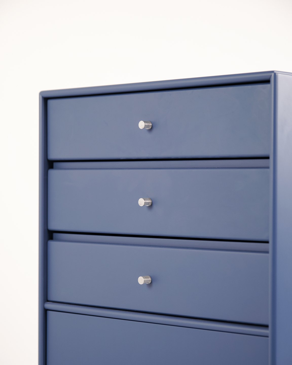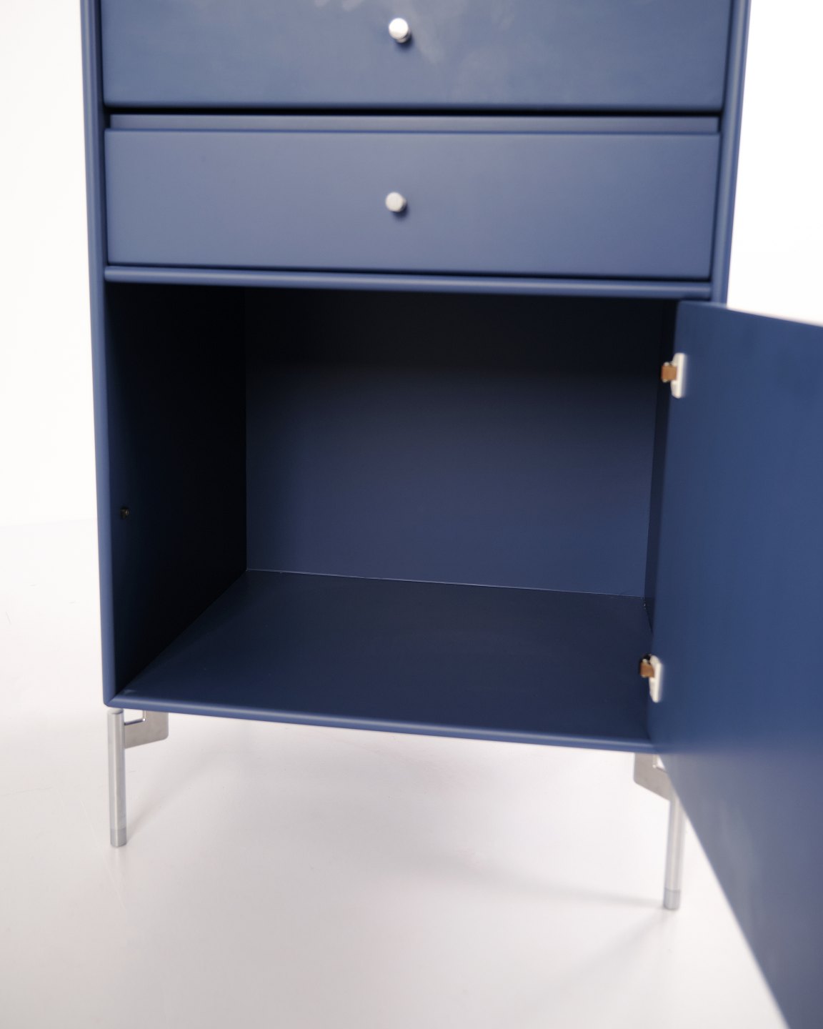 Montana skab / arkivskab i blå, monteret med krom ben. Indrettet med tre skuffer og én låge, ideelt til opbevaring i kontor, stue eller entre. Klassisk Montana-modul med høj funktionalitet og tidløst design.