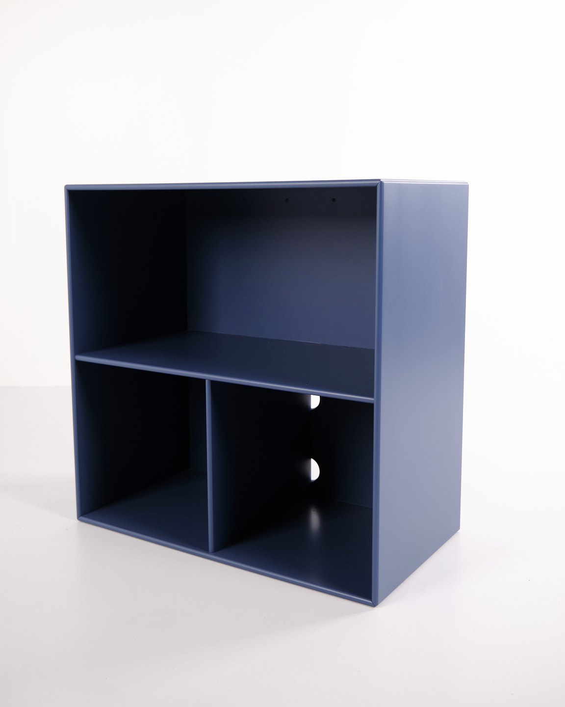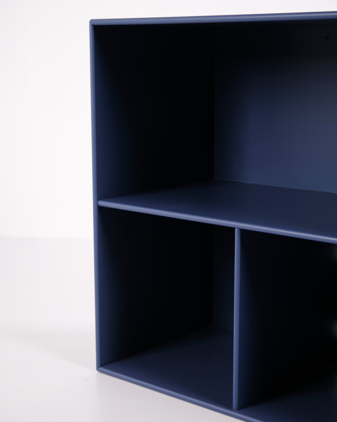 Montana reol i blå med krom ben. Udstyret med tre åbne hylder, ideel til opbevaring eller udstilling i stue, kontor eller entré. Klassisk Montana-modul med enkel opbygning og høj funktionalitet.