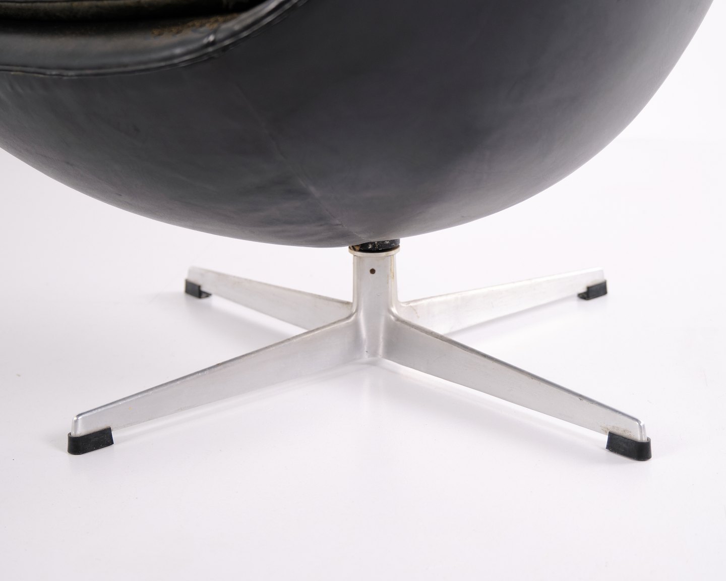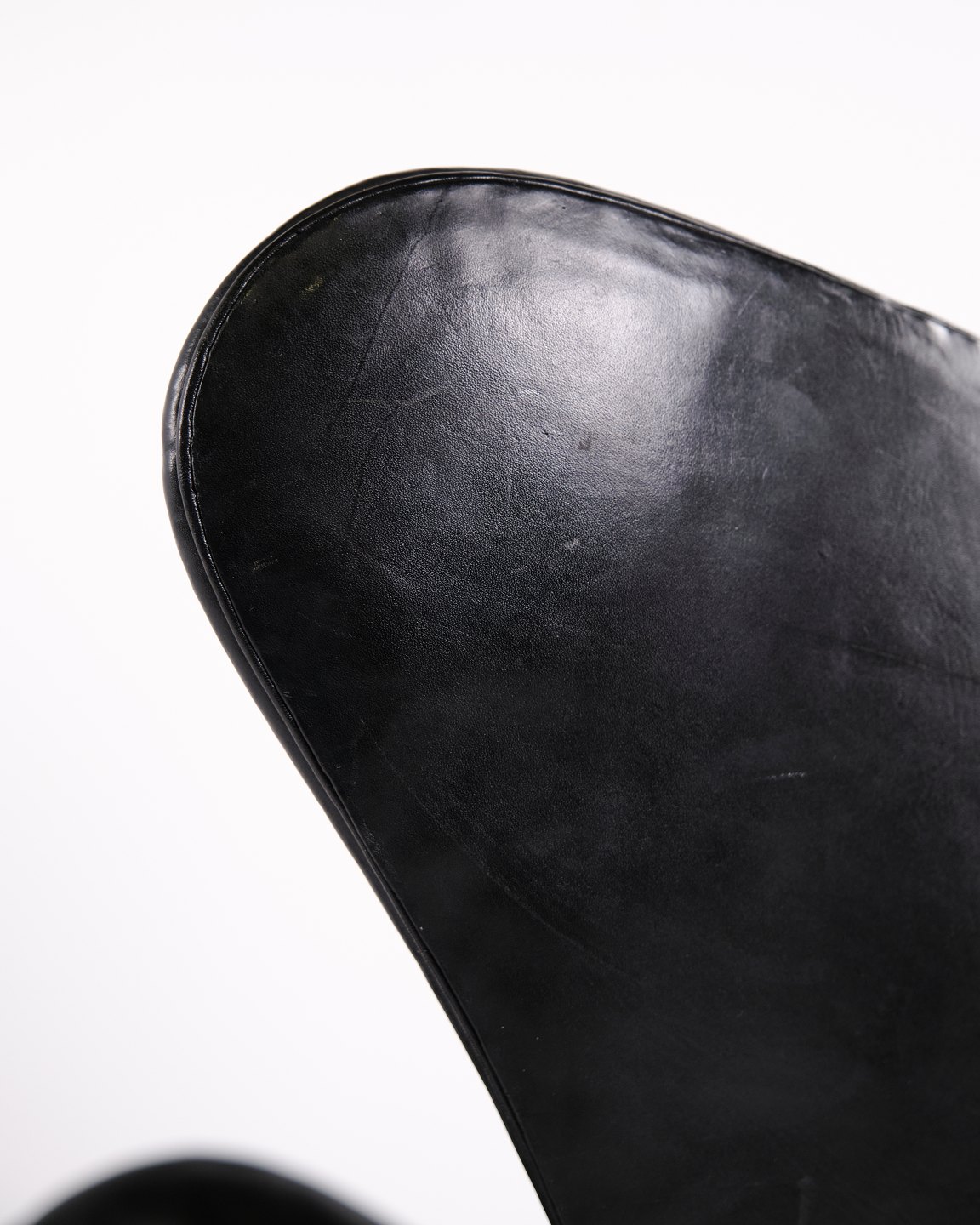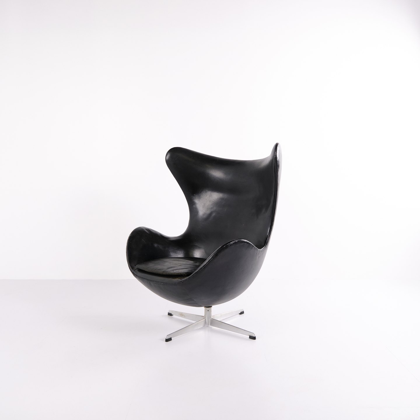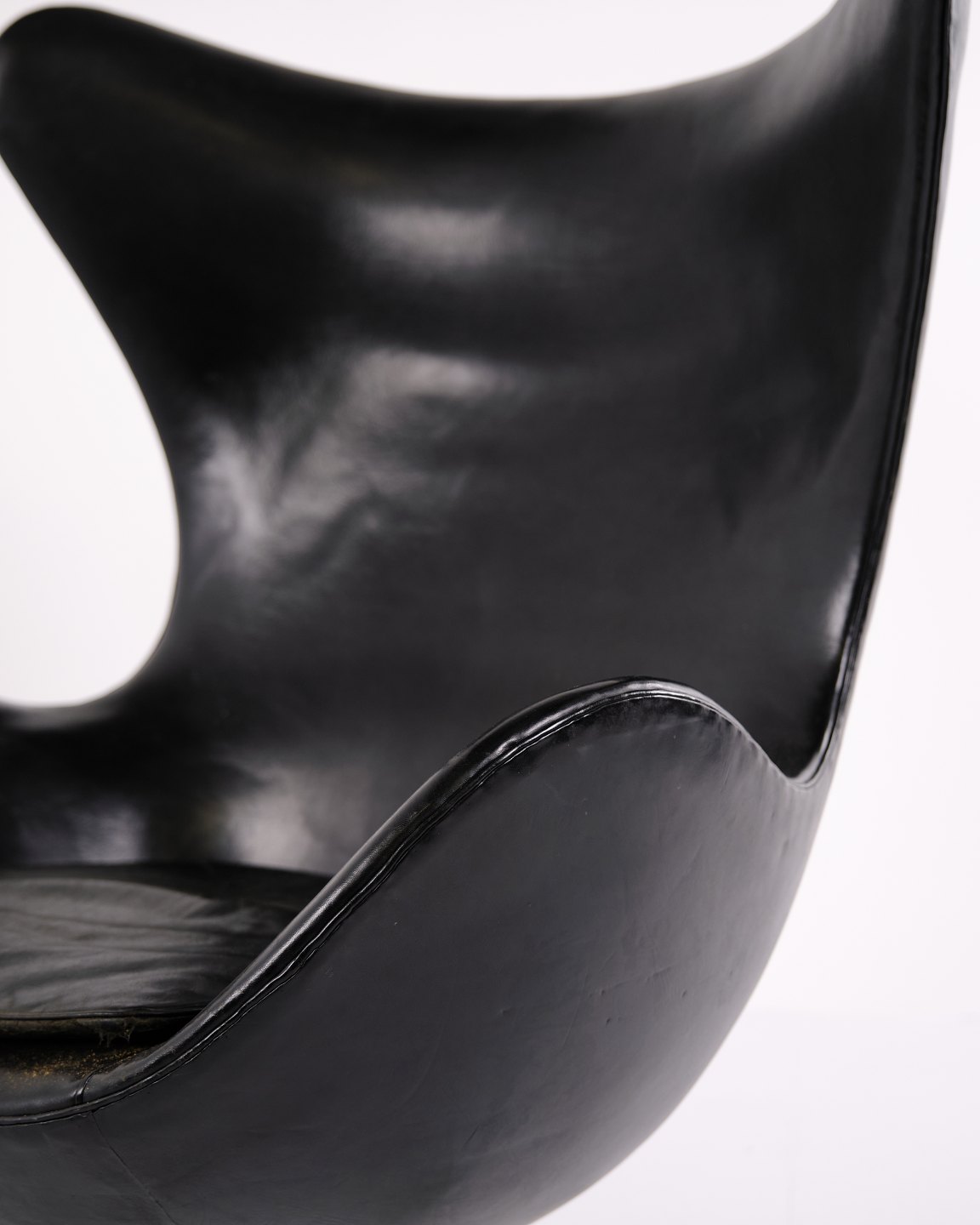 Ægget stol designet af Arne Jacobsen og produceret af Fritz Hansen. Ældre model, betrukket med sort original læder og monteret på aluminiumsfod. Et klassisk dansk designikon fra en tidligere produktionsperiode, hvor stolen blev udført med markante organiske kurver og en særlig dyb læderkvalitet.