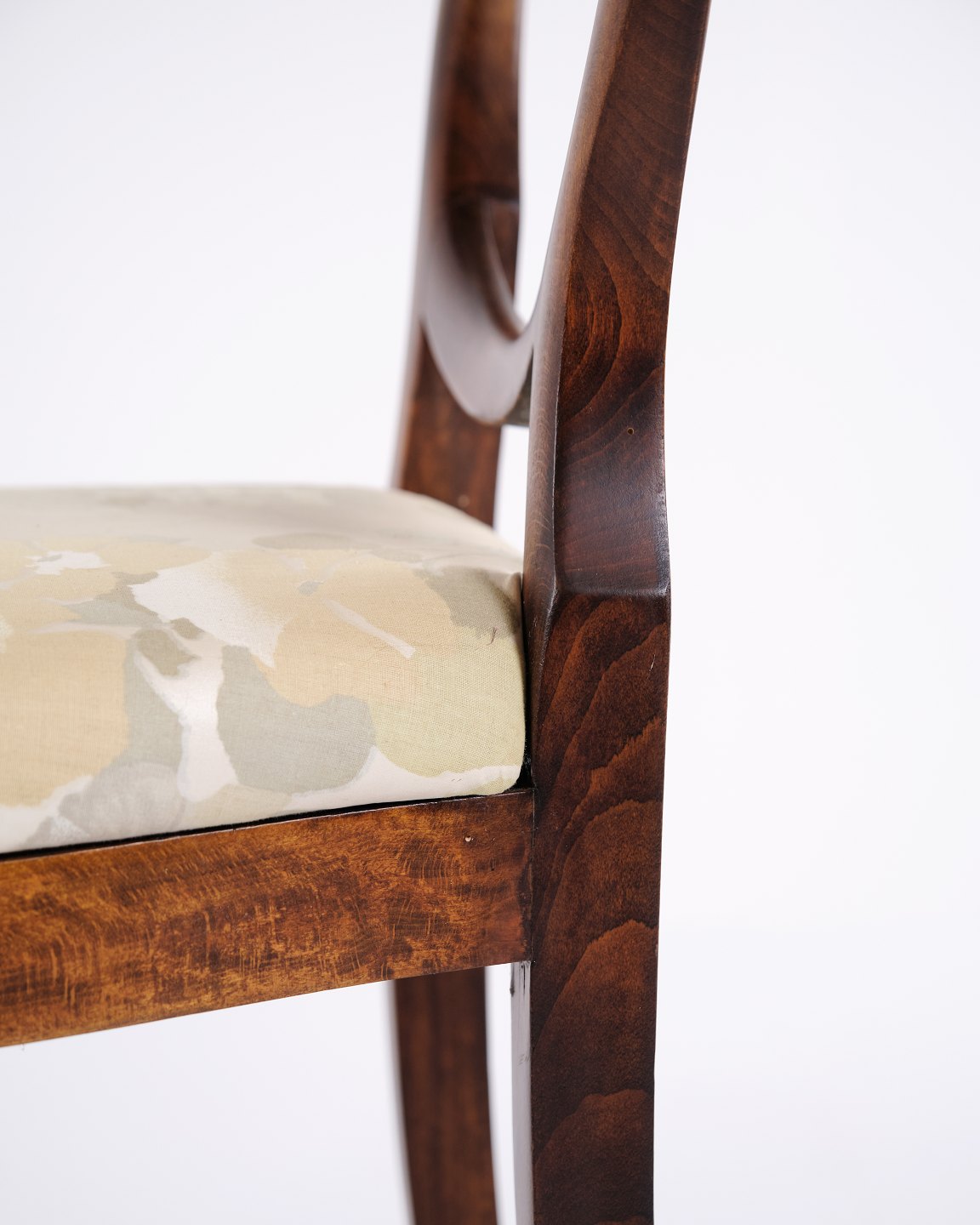 Sæt af fire salon-/spisestuestole fra 1860’erne, udført i mahogni og betrukket med lyst blomsterstof. Rokoko-inspireret design med udskårne detaljer og klassiske proportioner. Elegante stole til spisebord, stue eller entré.