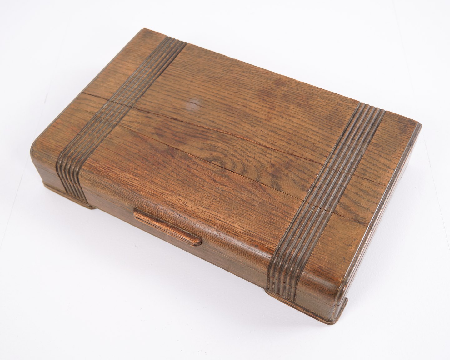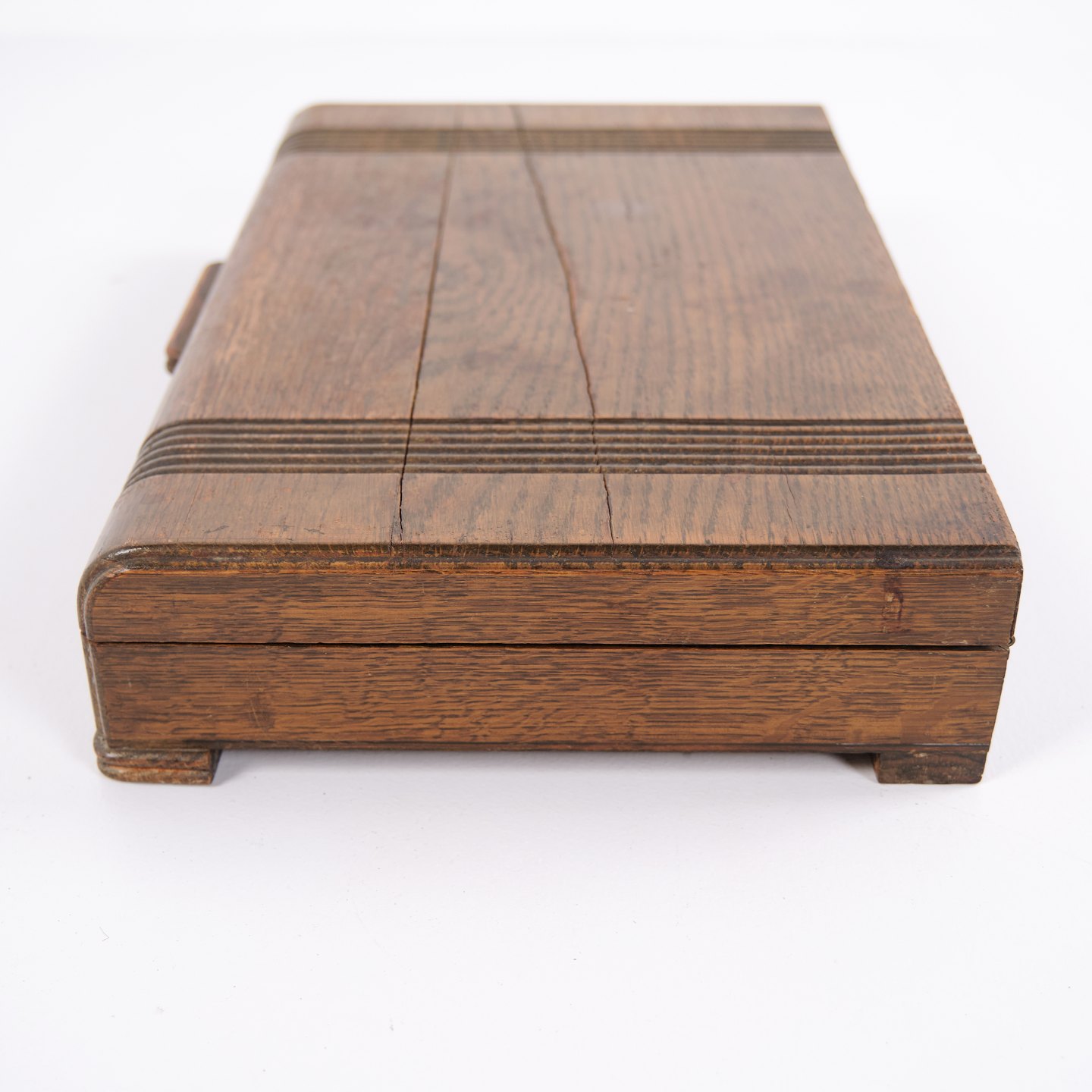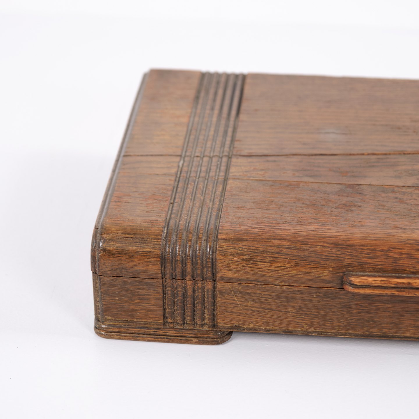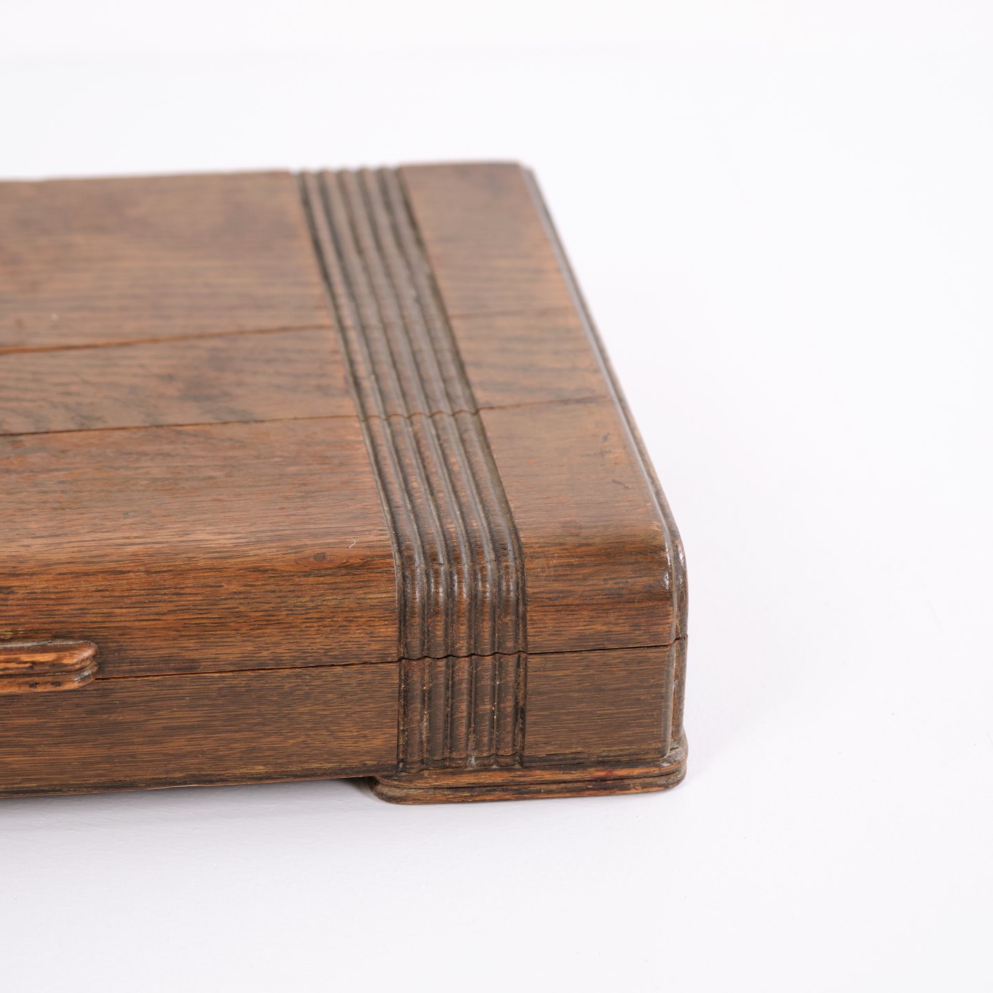 Antik bestikkasse i egetræ med grøn indmad og messingbeslag. Klassisk opbevaringskasse til bestik, sølv og småting. Solidt håndværk.