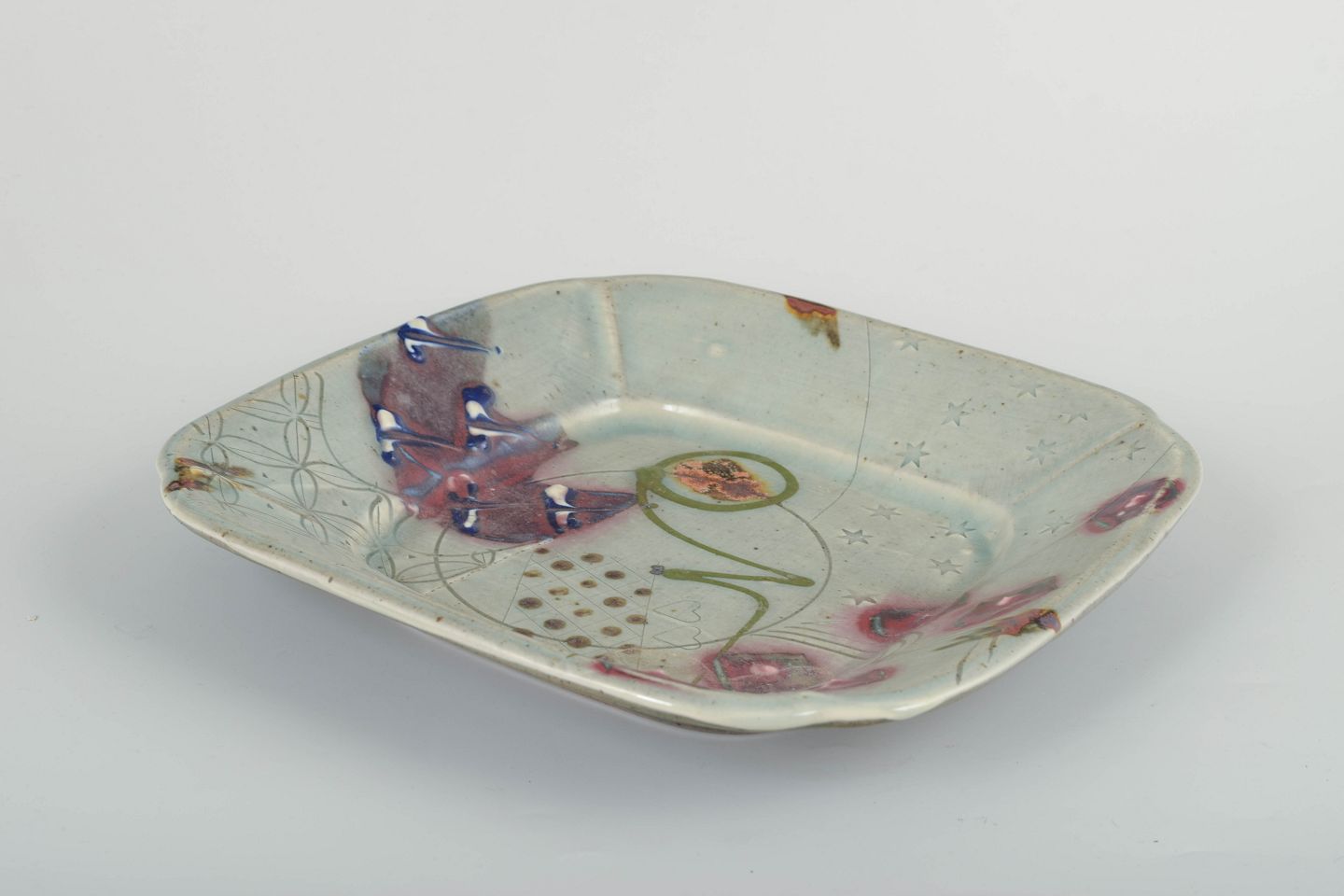 Unique square dish in Chinese-inspired style with decorative relief and brush-painted motifs, featuring a light celadon-style glaze with coloured accents. Signed.
