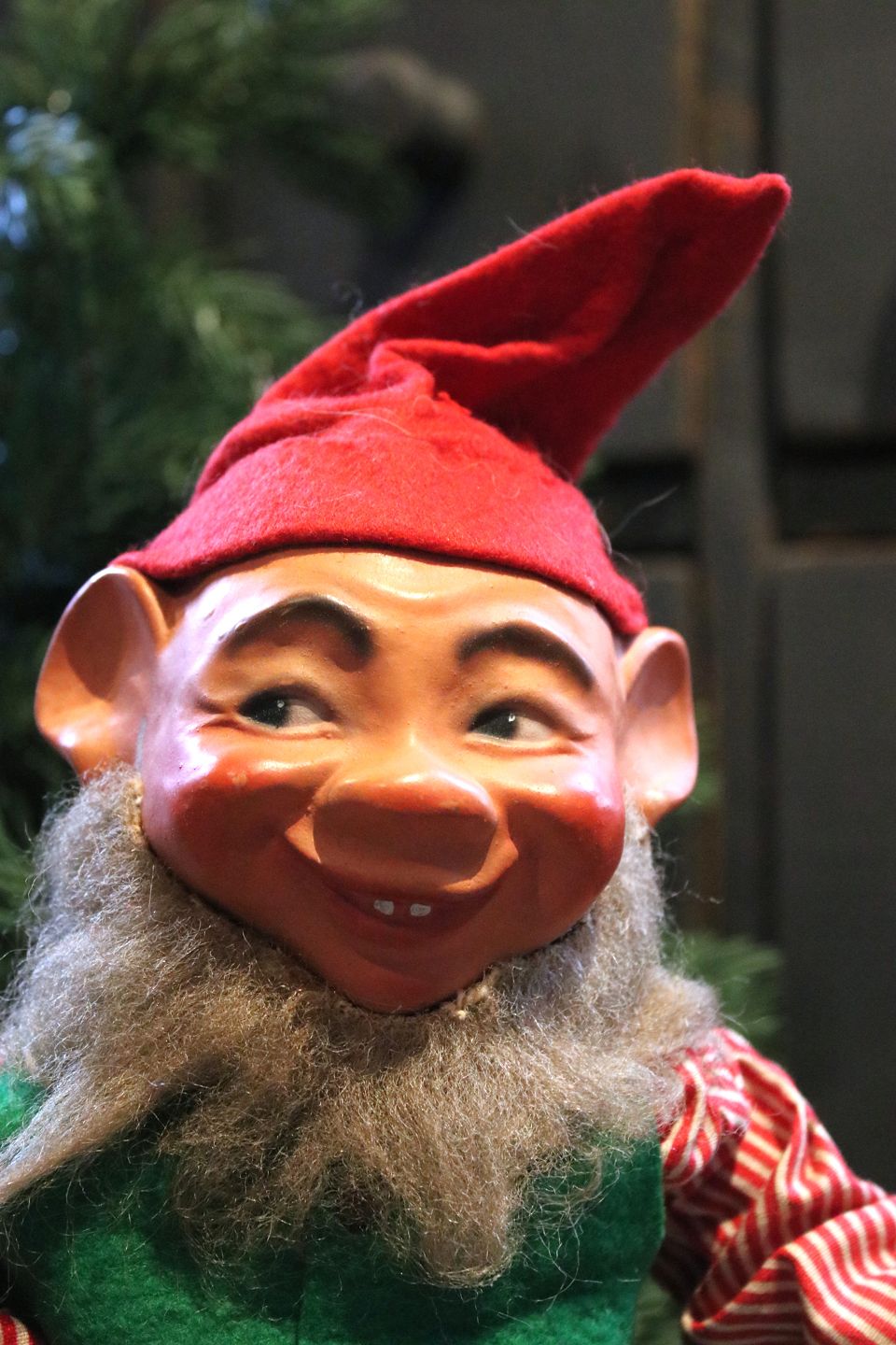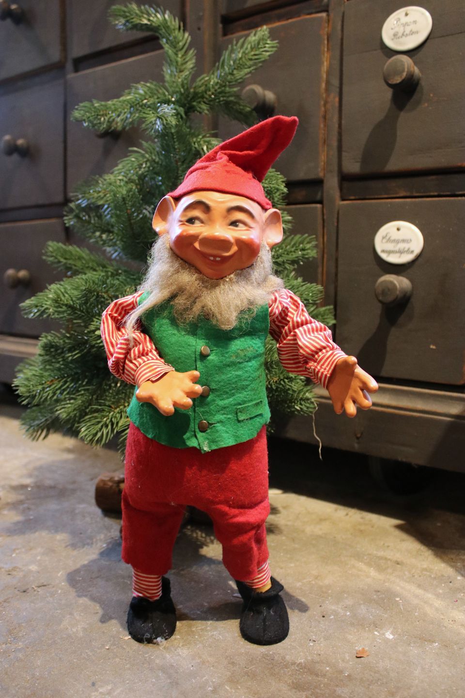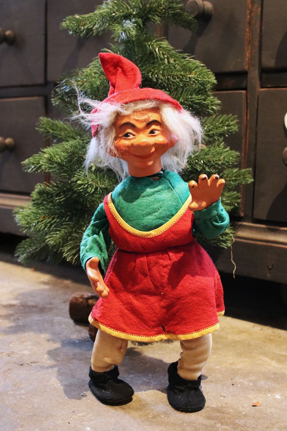 2 gamle butiksnisser med filt tøj og ansigt i bemalet papmache.