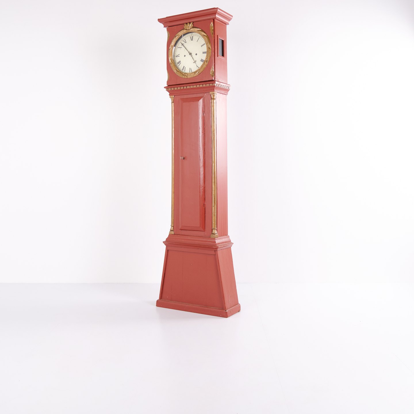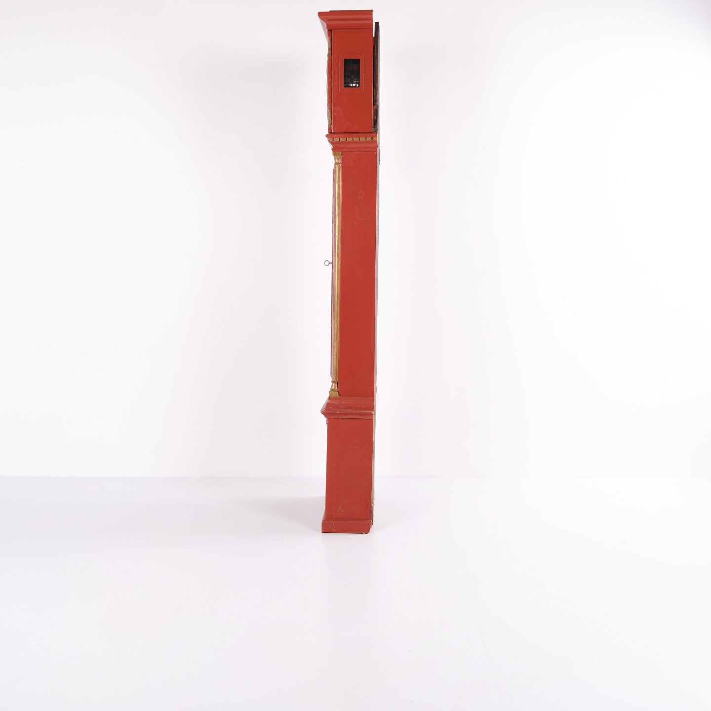 Bornholmerur fra ca. 1820’erne, rød­bemalet med dekorative udskæringer og klassisk formsprog fra perioden. Et originalt standerur med karakter og tidsrigtige detaljer.