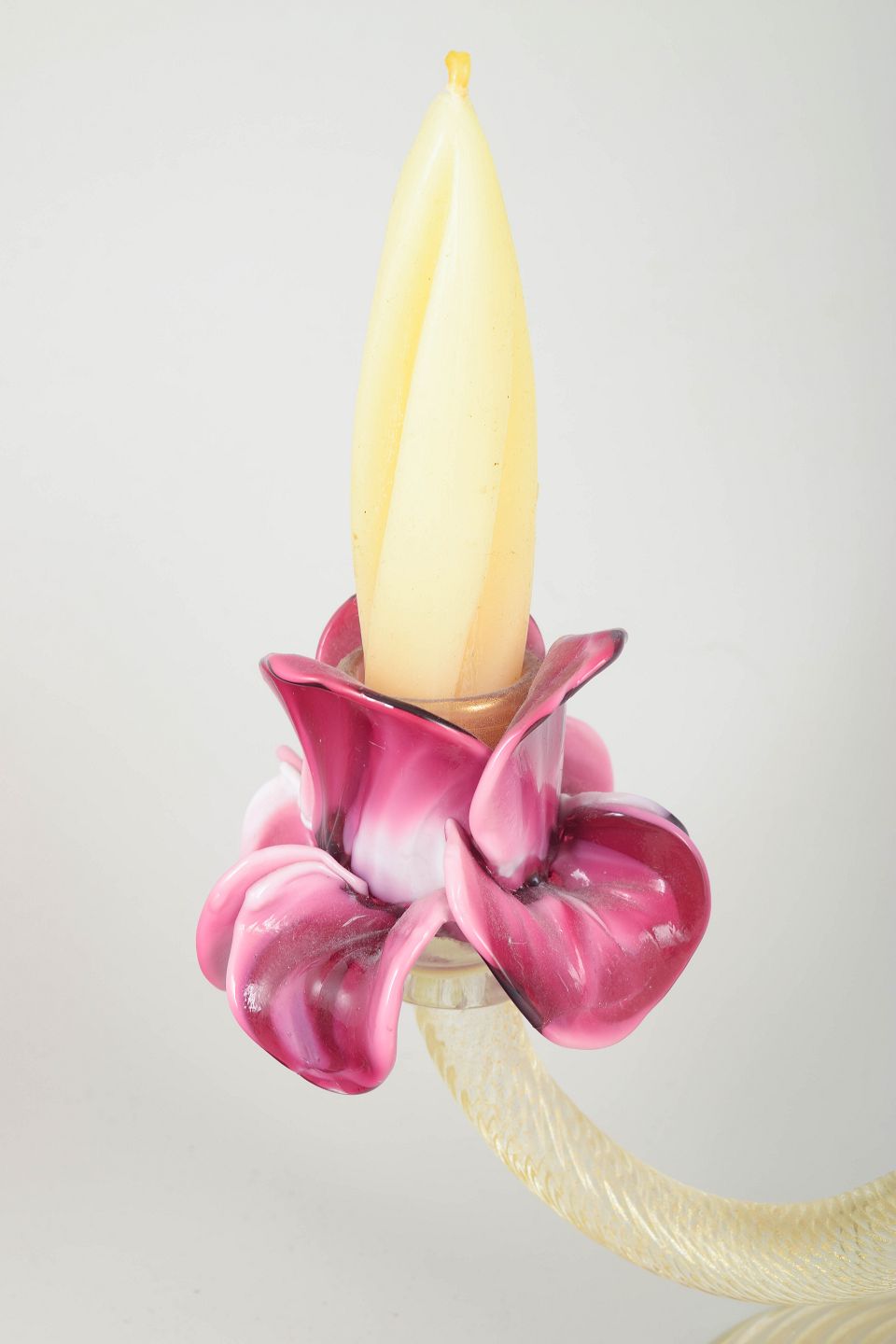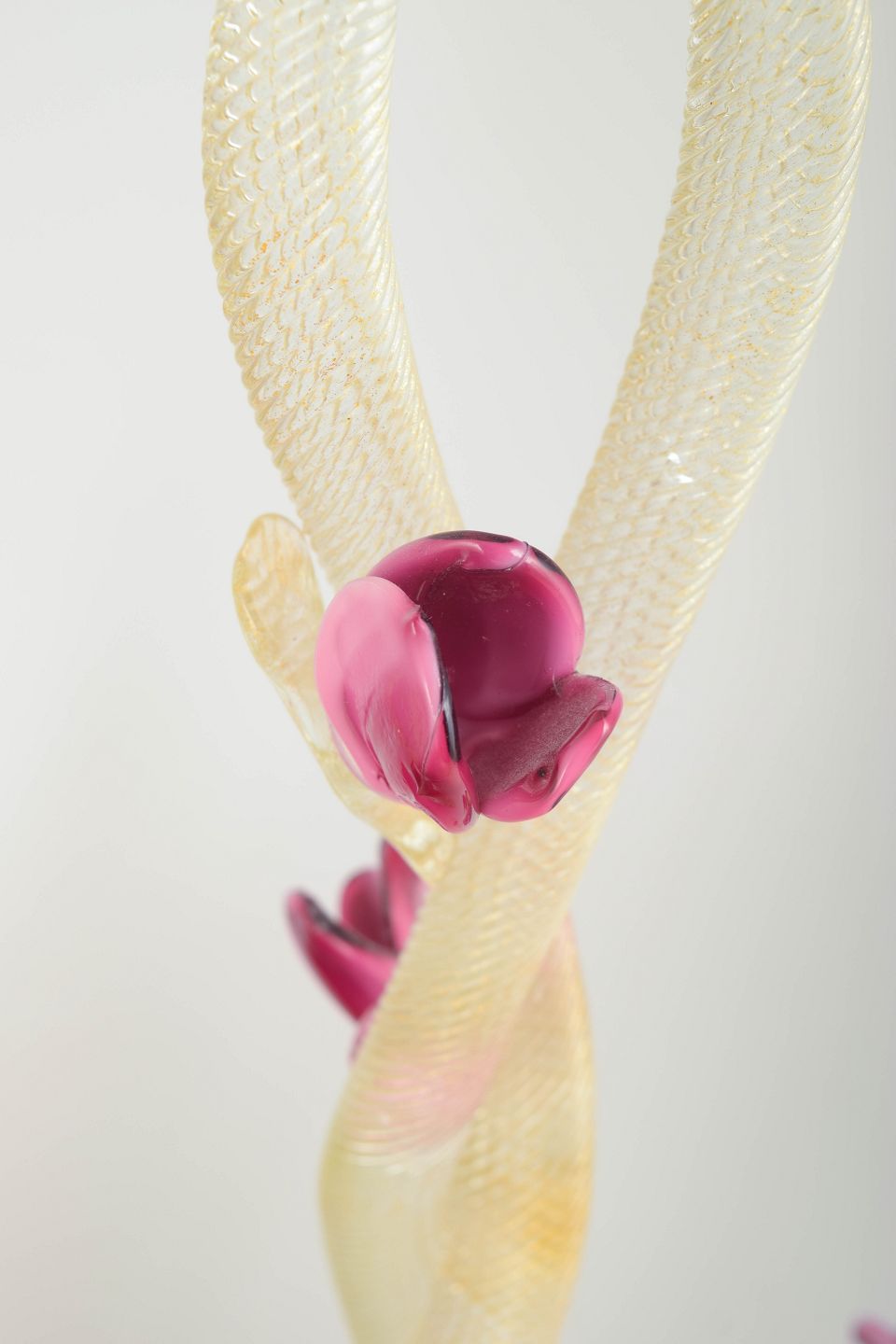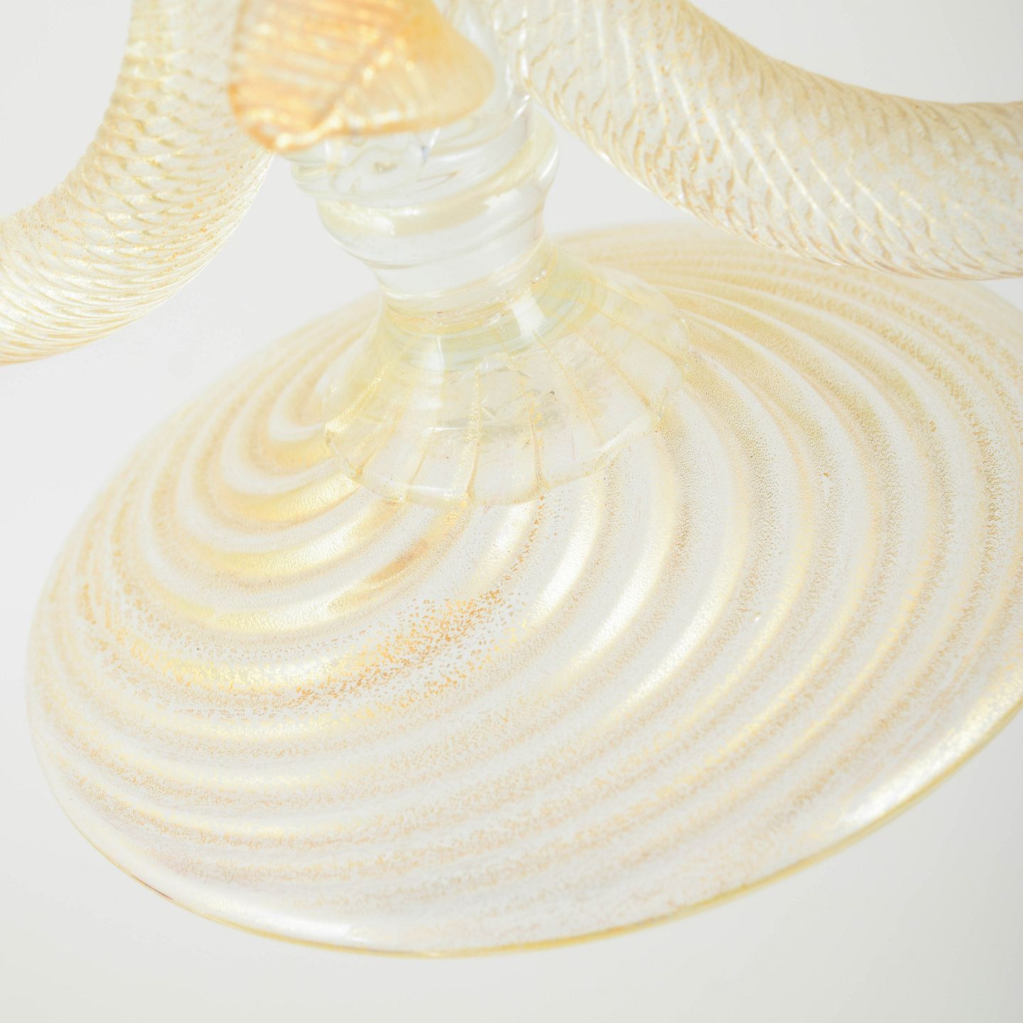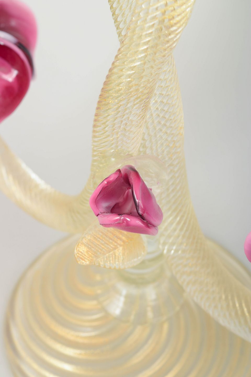 Imponerende mundblæst Murano-lysestage med to lysholdere, udført i spiralformet klart glas med guldstøv (avventurina) og dekorative blomster i dybe rosa/purpurfarver. Et elegant og skulpturelt stykke italiensk glasdesign fra 1960’erne.