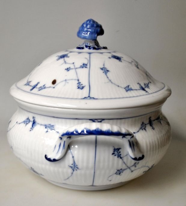 Royal Copenhagen rund terrin, no. 2, musselmalet, riflet,1850 - 1875, København, Danmark. Med låg. Stemplet. H.: 24 cm. Dia.: 24 cm.