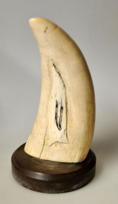 Grønlandsk kaskelot tand monteret på bakelit fod. 19.-20. årh. Den ene side dekoreret med udskåret fugl. H.: 13,8 cm. Højde med fod: 16 cm.
