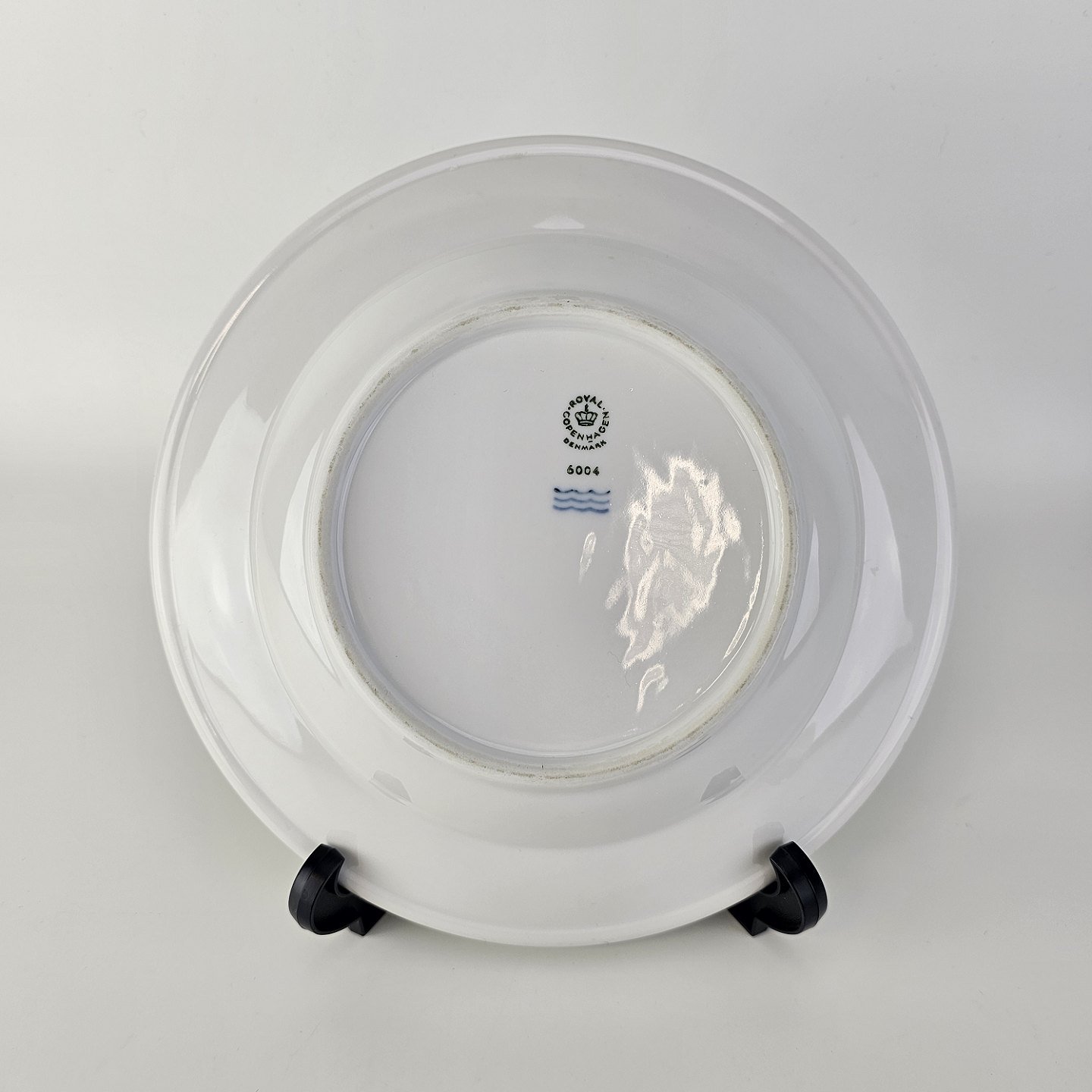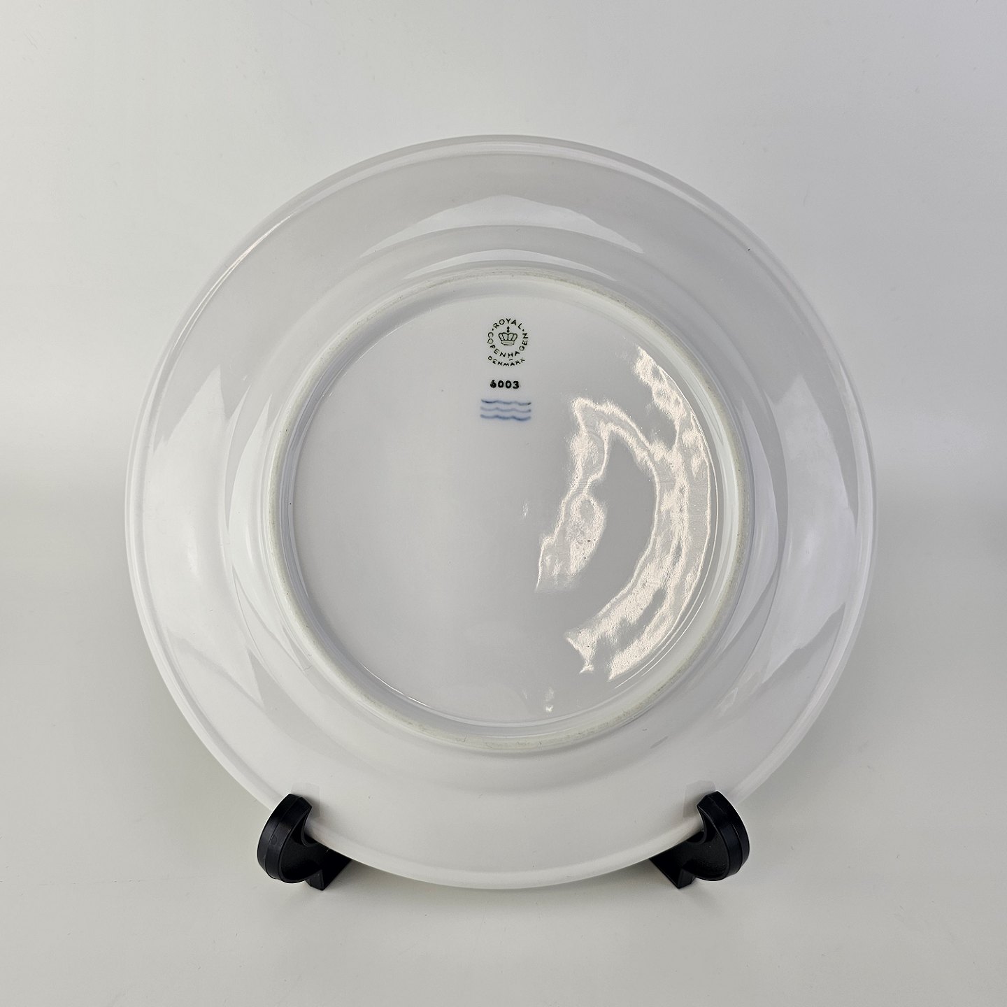 Sæt hotelporcelæn af flade middagstallerkener, flade frokosttallerkener og dybe tallerkener i kongeligt porcelæn dekoreret med røde streger og logoet for Holm & Wonsilds rederi