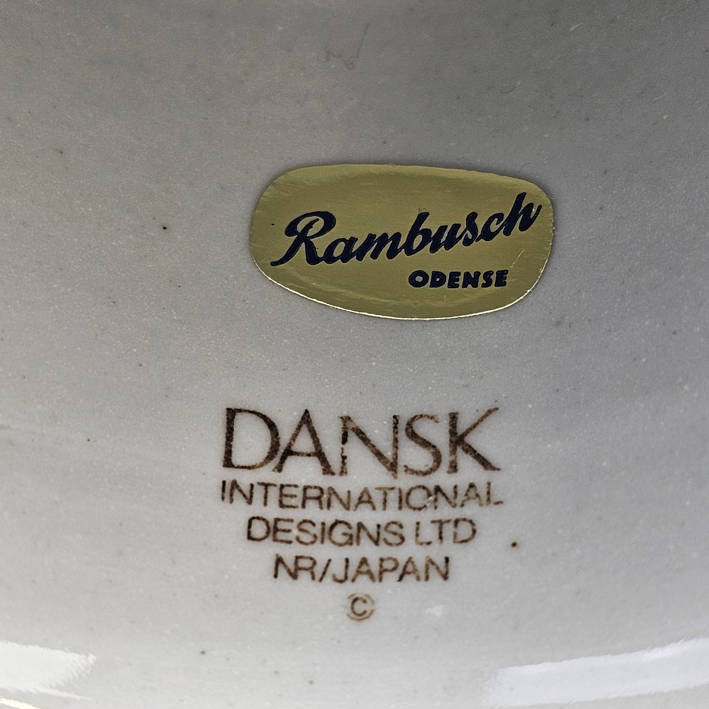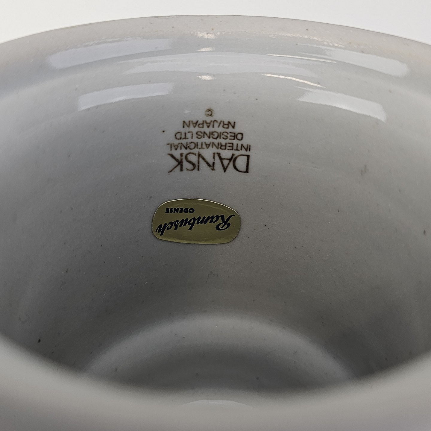 Krukke i glaseret stentøj med dekoration af tre blå striber