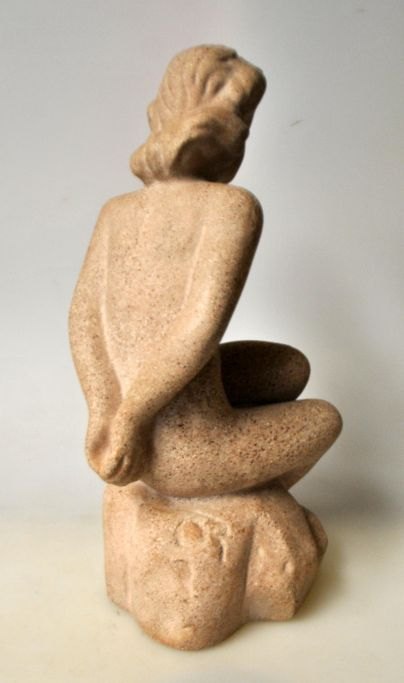 Rasmussen, Ove Fritz (1911 - 1973) Danmark: En siddende nøgen kvinde. Sandstensfigur. Signeret. H.: 24 cm.