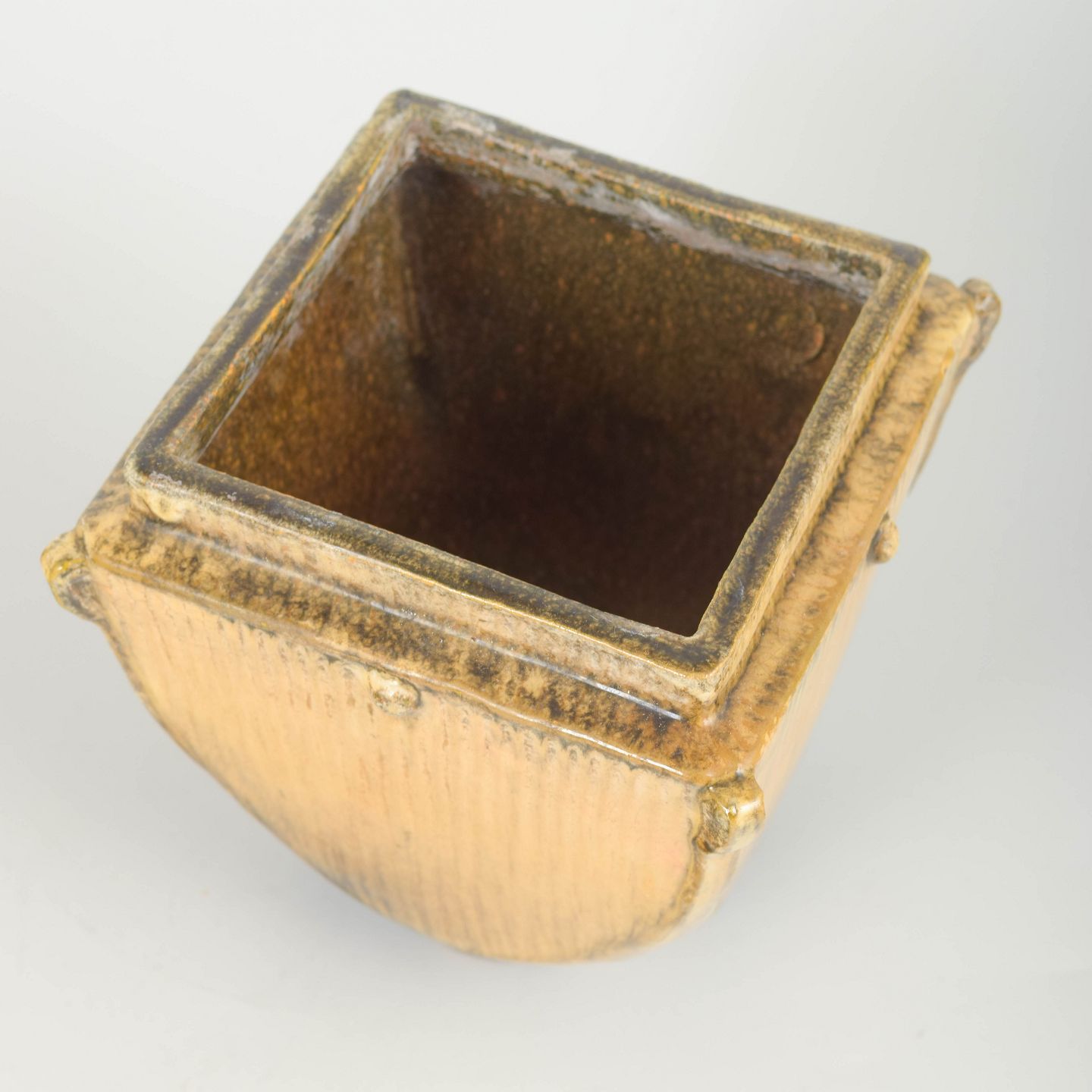 Karakteristisk vase af Svend Hammershøi for Kähler, udført i 1920/30’erne. Formen er firkantet med let rundede sider og diskrete knopdetaljer ved hjørnerne. Den vertikale rifling og den varme gulbrune glasur er typiske for Hammershøis arbejder i denne periode.