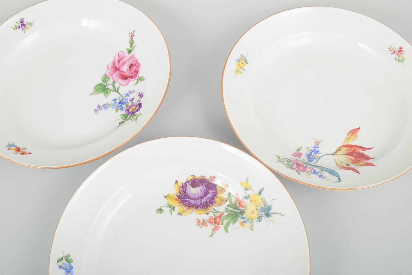Håndmalede tallerkener i hvidt porcelæn med farverige blomsterdekorationer i klassisk Meissen-stil. Elegant udtryk med let asymmetrisk placering af motiverne.