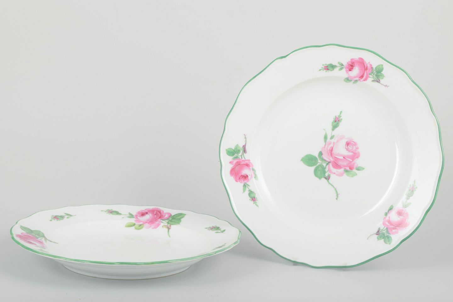 Smukke tallerkener i hvidt porcelæn med håndmalede lyserøde roser og grøn bort langs den svungne kant. Klassisk Meissen-kvalitet og elegant dekoration i tidstypisk 1930’er-stil.