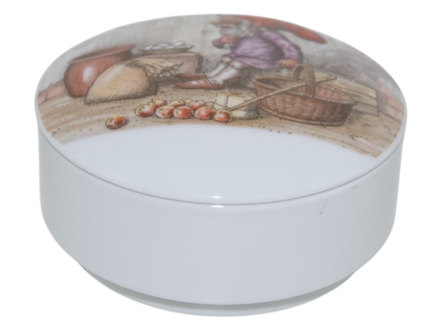 Bing & Grøndahl, rund bonbonniere med julenisse der skal i gang med at bage æbleskiver.