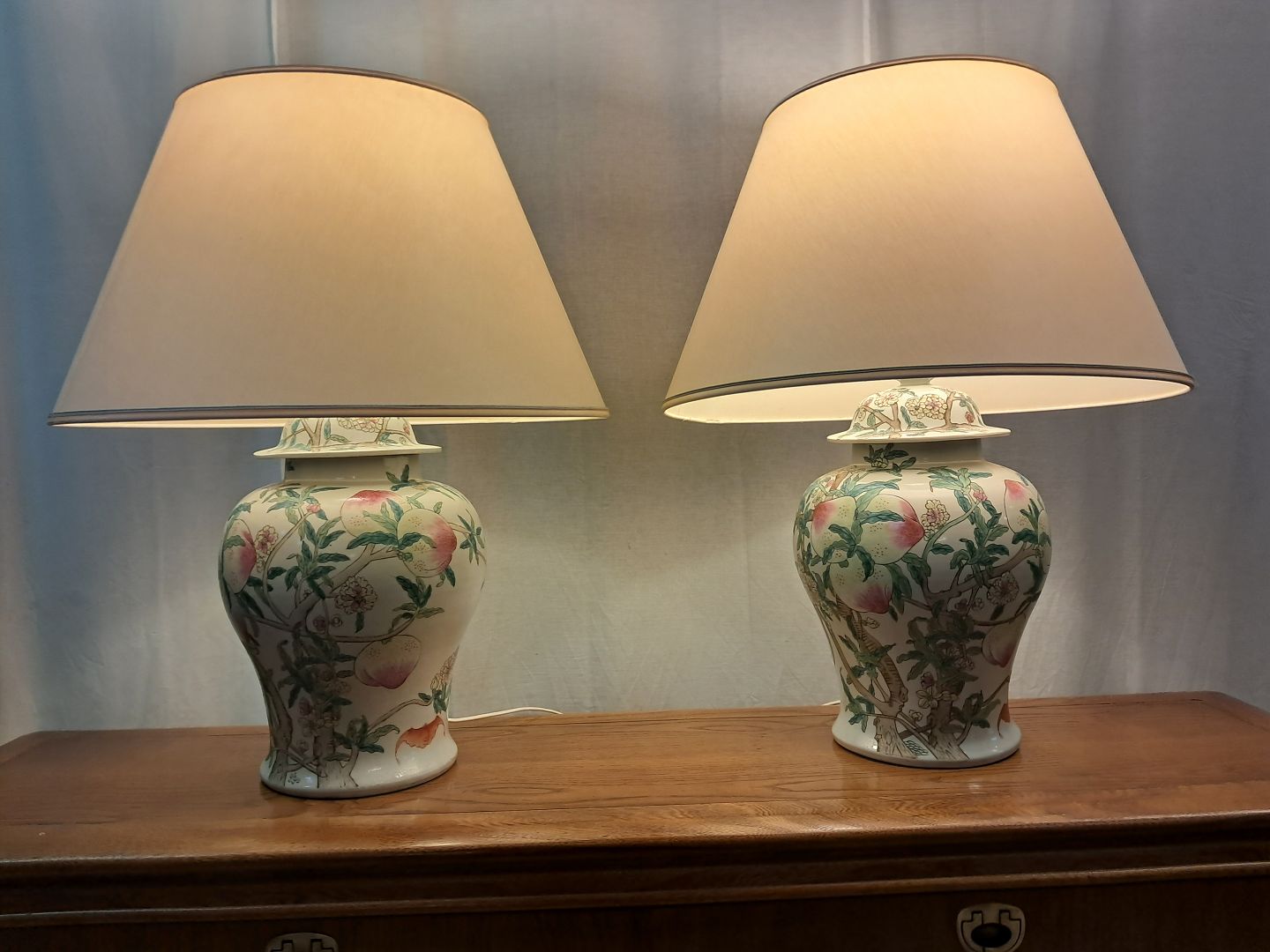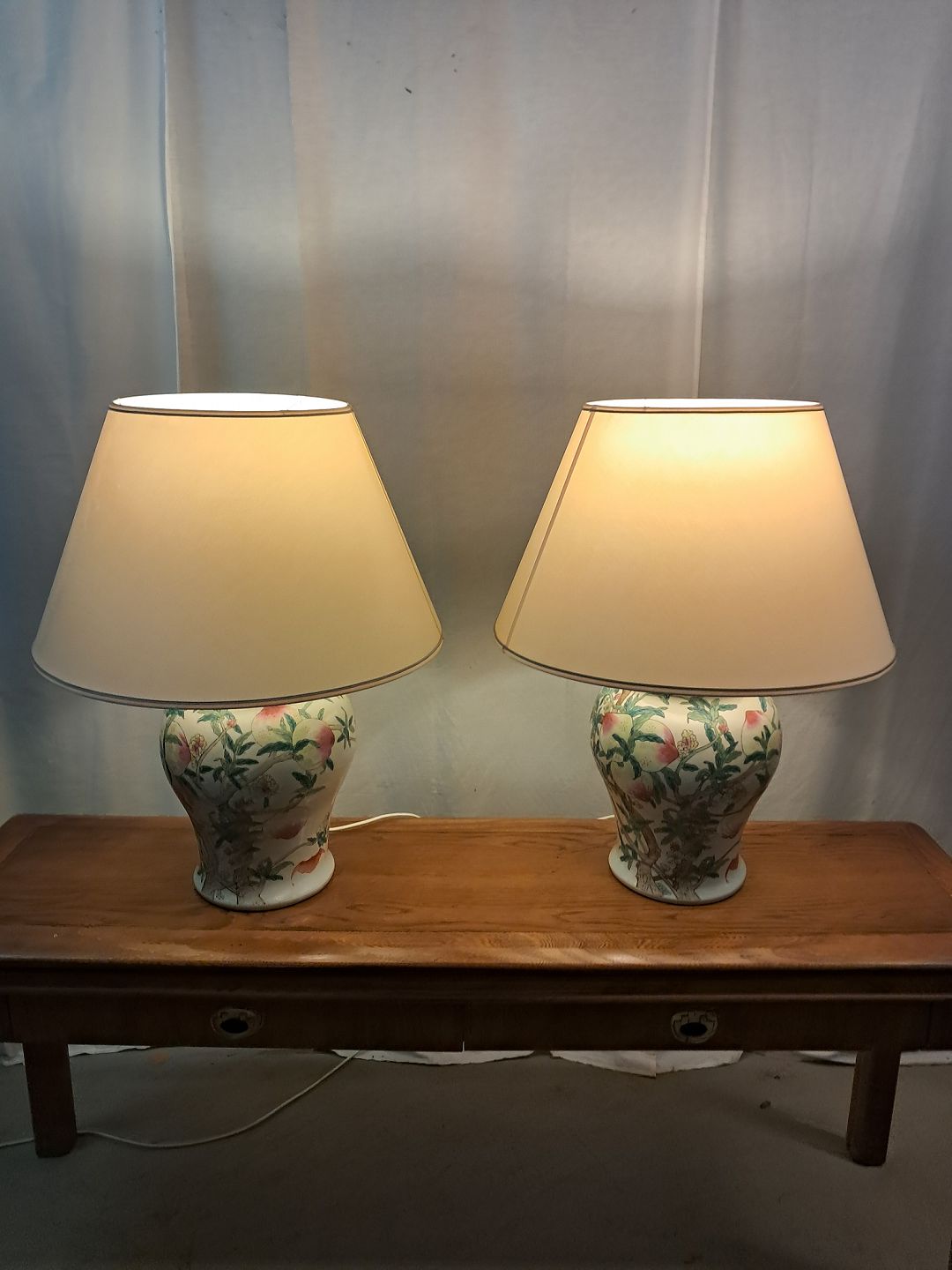 2 Asiatiske bordlamper i pocelæn med skærme, fra 1990erne.