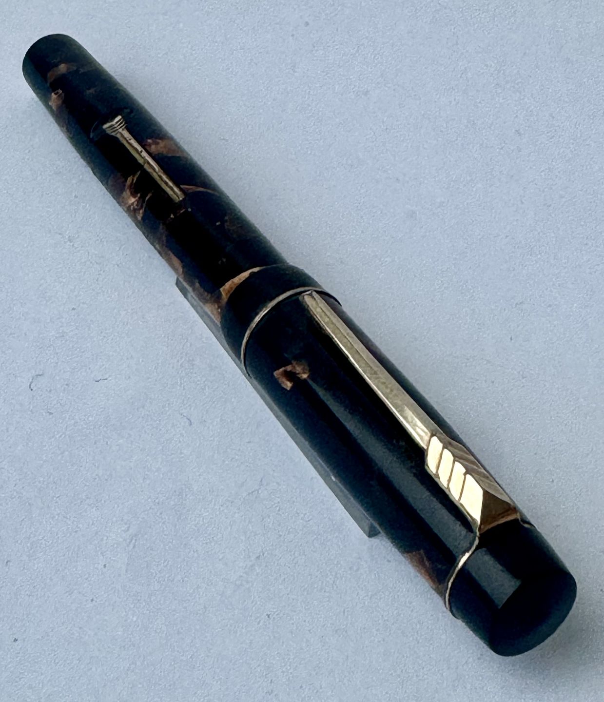 Black and brown marbled Croxley fountain pen. Lever filler ink refill system. New rubber sack must be inserted before the pen can absorb ink and write again. Unoriginal 14 carat gold nib. Length: 12.5 cm