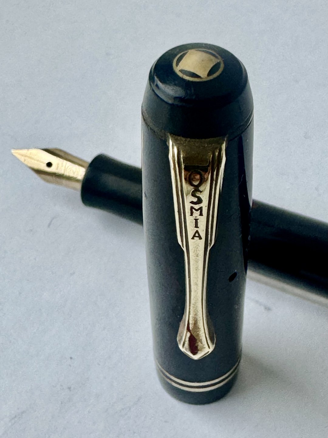 Black Osmia fountain pen with piston filler that needs to be repaired before the fountain pen can absorb ink and write again. Appears in good condition without damage. All parts original to this model including an Osmia number 2 gold nib in 14 carats. Length 11,5 cm