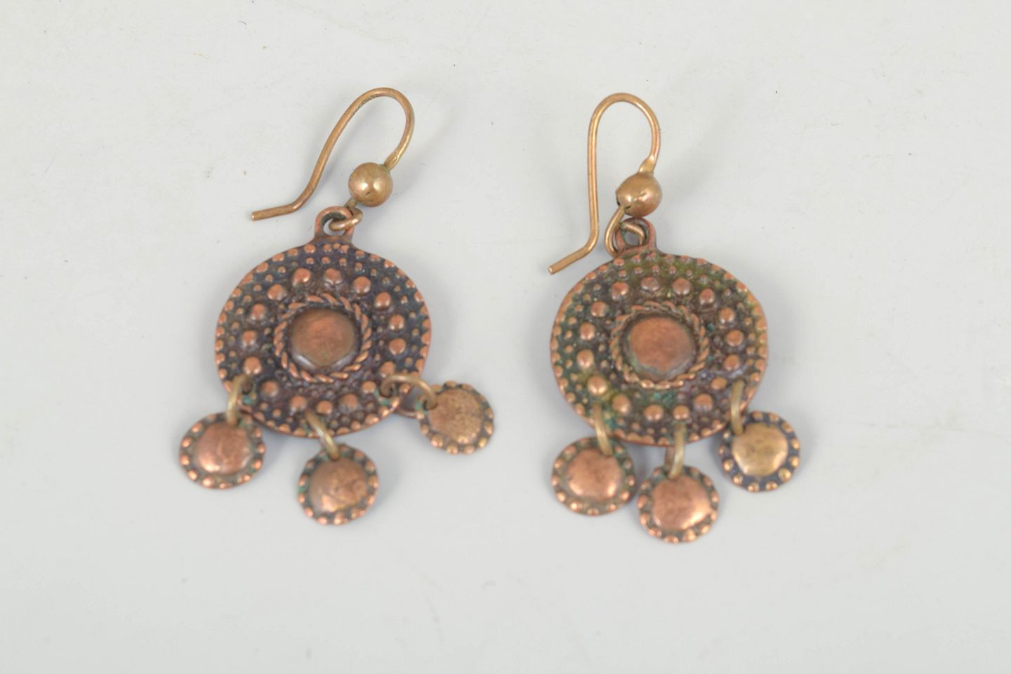 Par dekorative bronzeøreringe i Laine’s karakteristiske vikingeinspirerede, organiske formsprog. Ophængt medaljon med tre små dinglende elementer.
