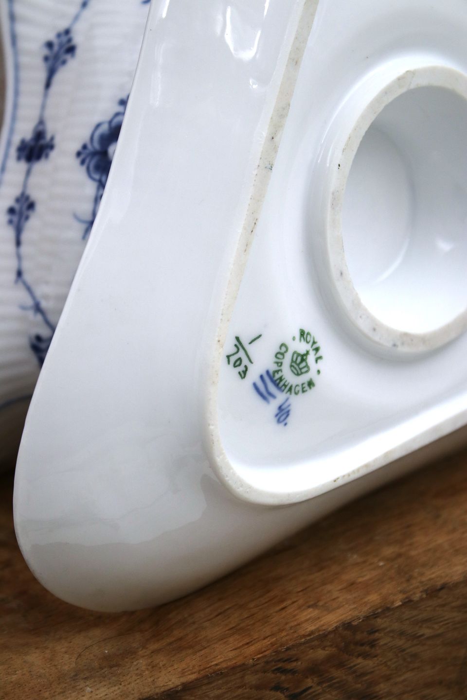 Royal Copenhagen Musselmalet Riflet trekantet sovsekande på fast underfad.