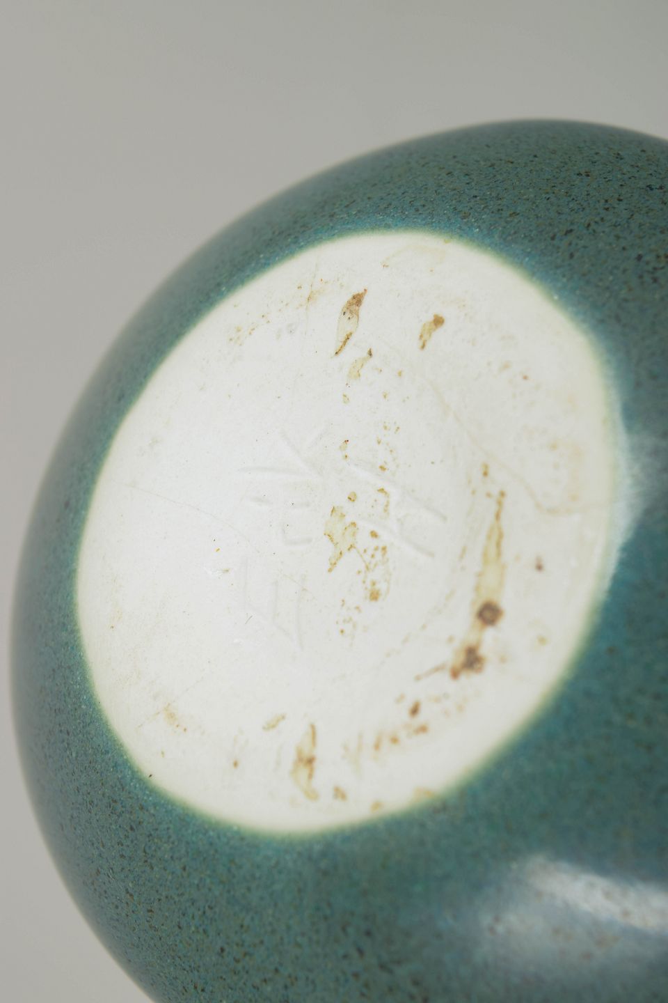 Lille, hånddrejet vase i stentøj med glat, afrundet krop og slank hals. Glasuren er i bløde turkis- og grønne nuancer med let spil og levende overgange, typisk for skandinavisk studiokeramik i perioden.