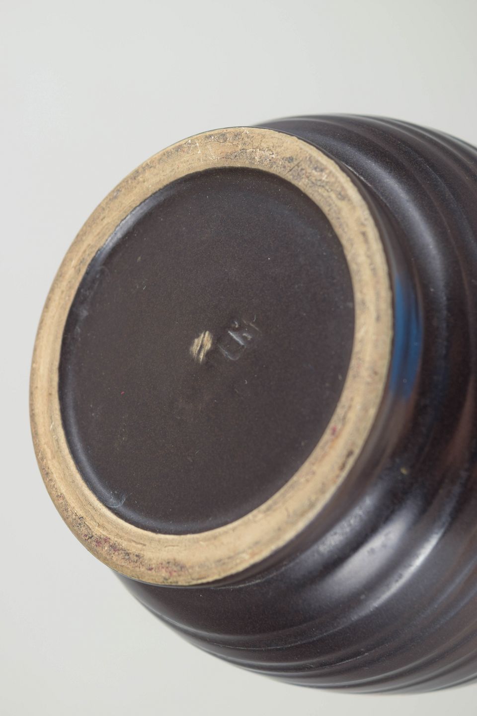 Hand-thrown pottery vase with a dark brown glaze and pronounced throwing rings that create a rhythmic, tactile surface. The classic teardrop form and understated proportions are characteristic of Bo Fajans’ handmade ceramics from this era.