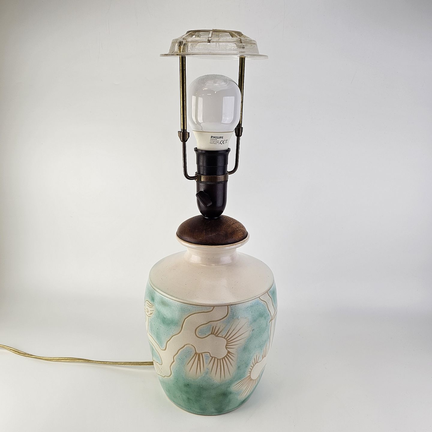 Bordlampe i hvid keramik med dekoration i blå og sort fatning