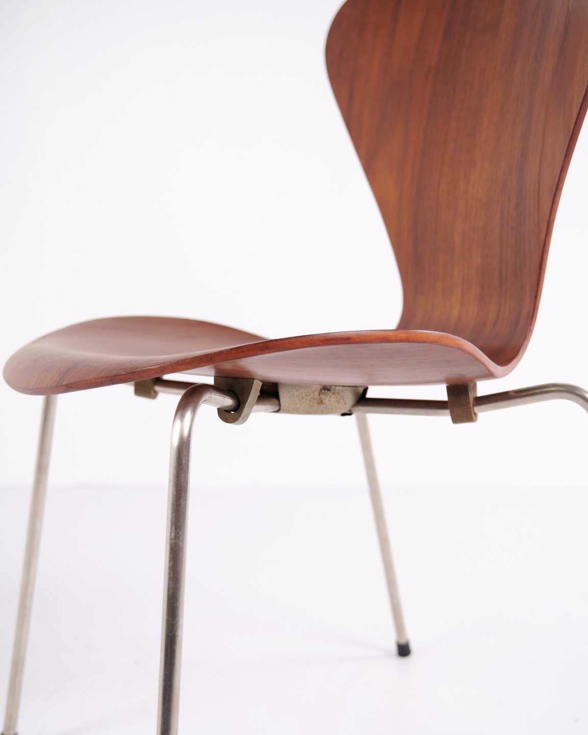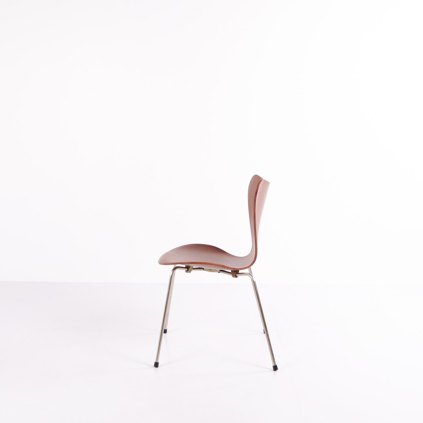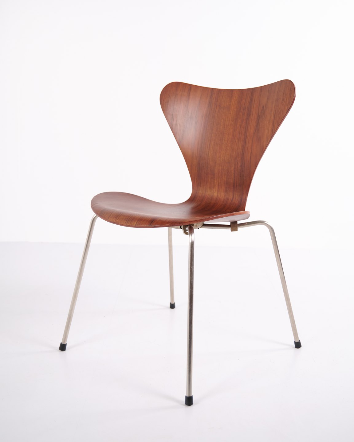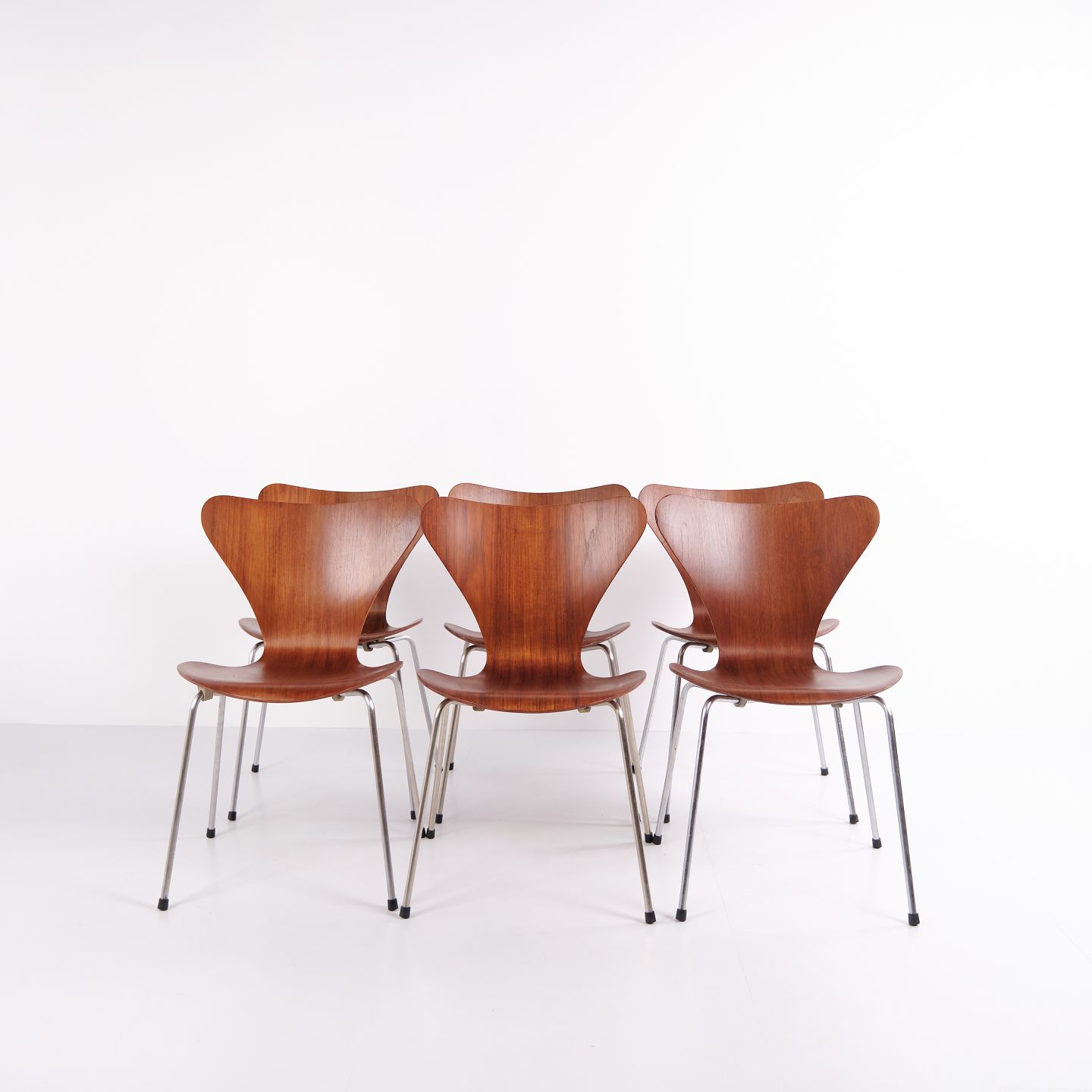 Sæt af seks Syver stole, model 3107, designet af Arne Jacobsen og produceret af Fritz Hansen. Udført i teakfinér med den karakteristiske formspændte skal, som gør stolen let, stærk og behagelig at sidde i. Model 3107 blev lanceret i 1955 og er i dag en af de mest ikoniske spisebordsstole inden for dansk design.