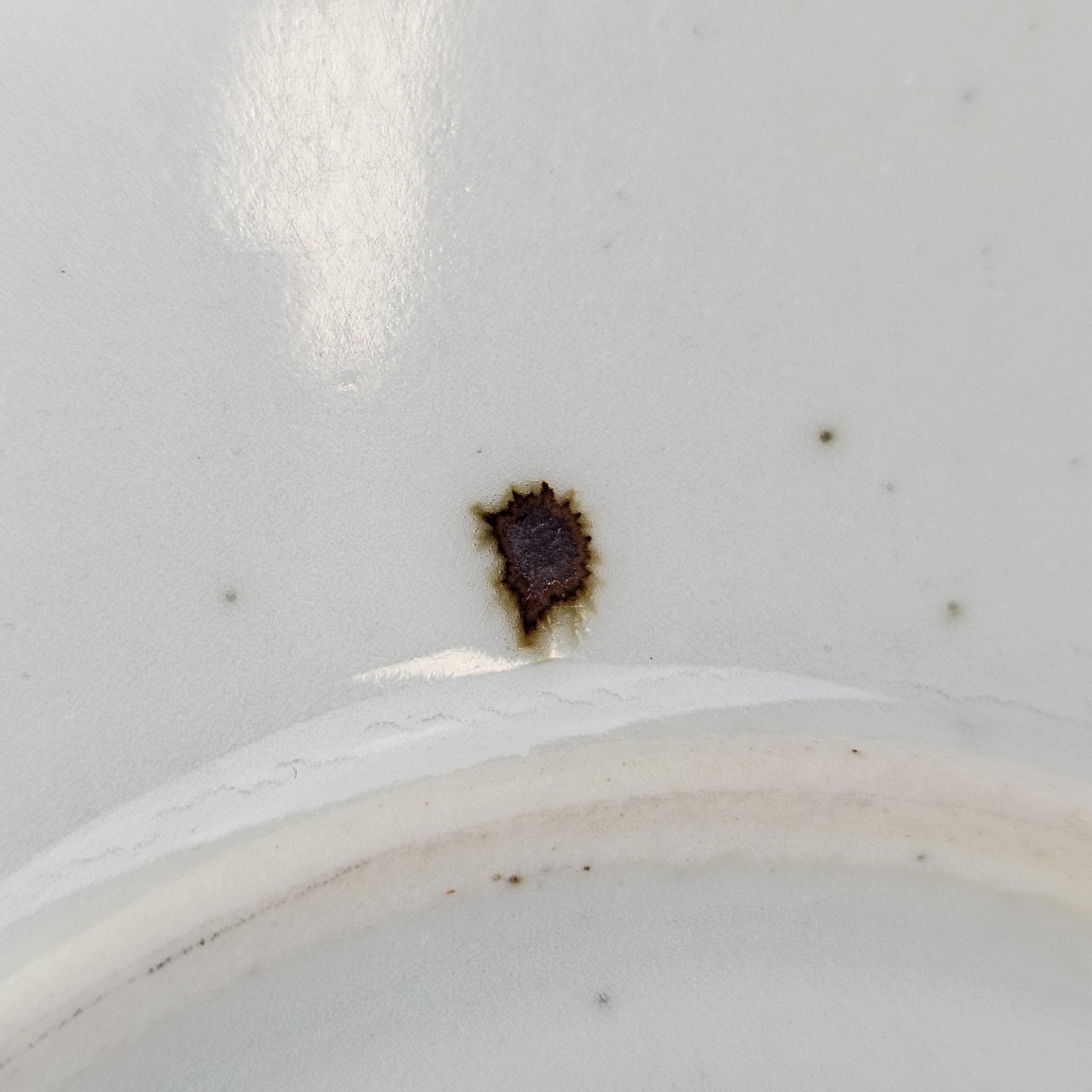 Rundt fad i stentøj med blå kant, jernpletter og hvid glasur