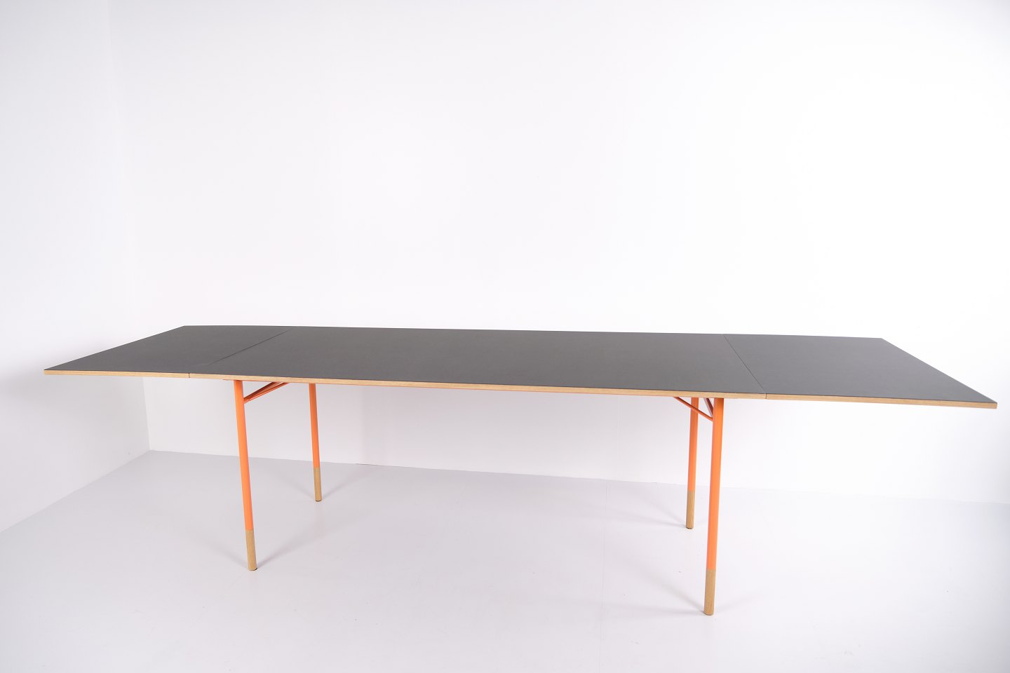 Nyhavn Dining spisebord designet af Finn Juhl i 1953 og produceret af House of Finn Juhl i 2015. Bordplade i grå linoleum med kanter i oregon pine samt orangelakerede stålben med træfødder. Inkl. to tillægsplader à 54 cm. Et klassisk Finn Juhl design med let udtryk og karakteristiske materialer.