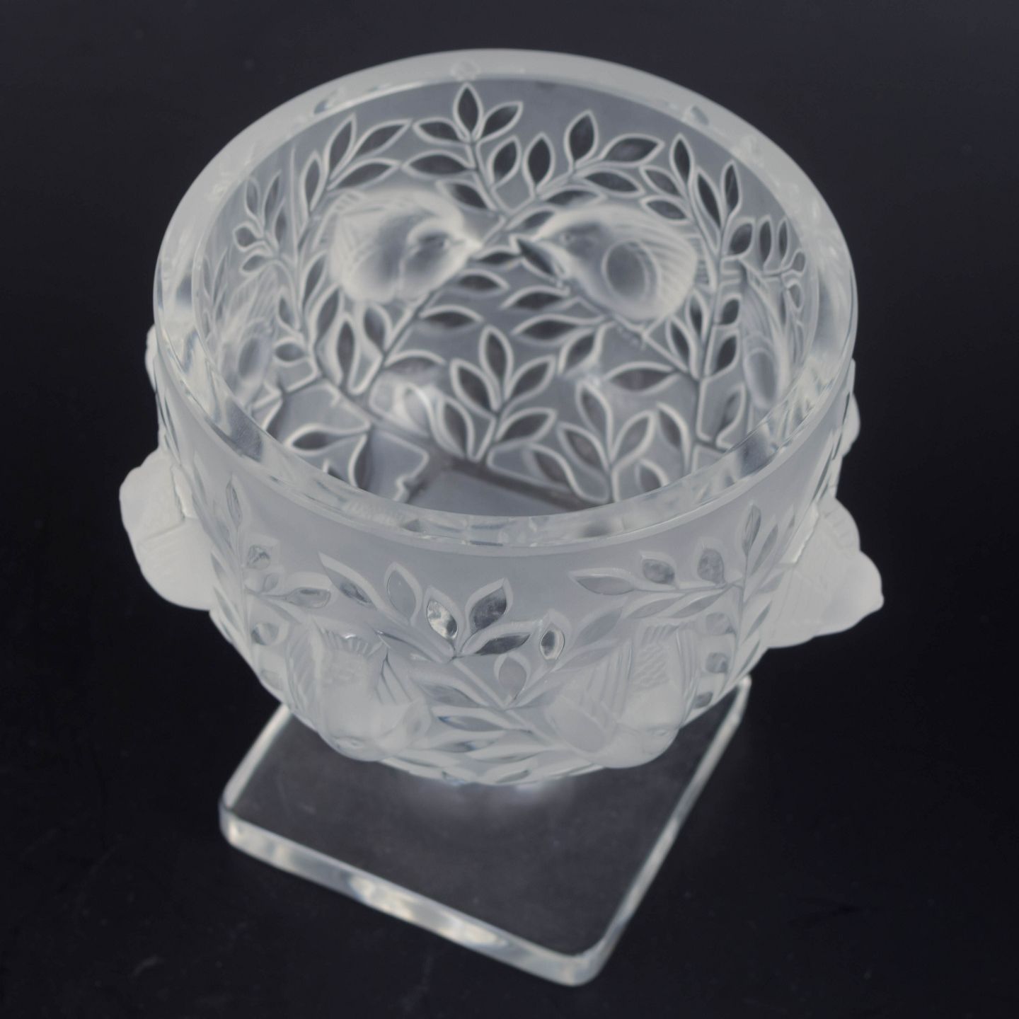 Frostet krystalglas vase på fod med firkantet base, rigt dekoreret med relief af blade og frugter i klassisk Lalique-stil. Den matte overflade kombineret med klare detaljer giver et elegant, skulpturelt udtryk.