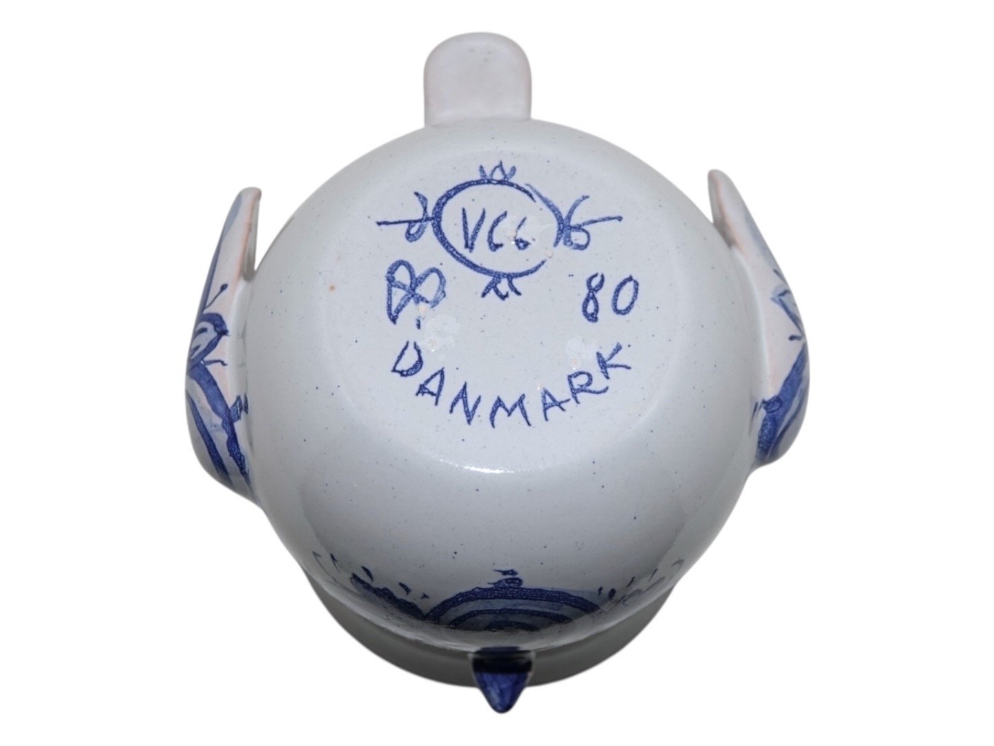 Bjørn Wiinblad keramik, lille urtepotteskjuler i form af fugl med næb, vinger og hale. Denne er med blå dekoration.