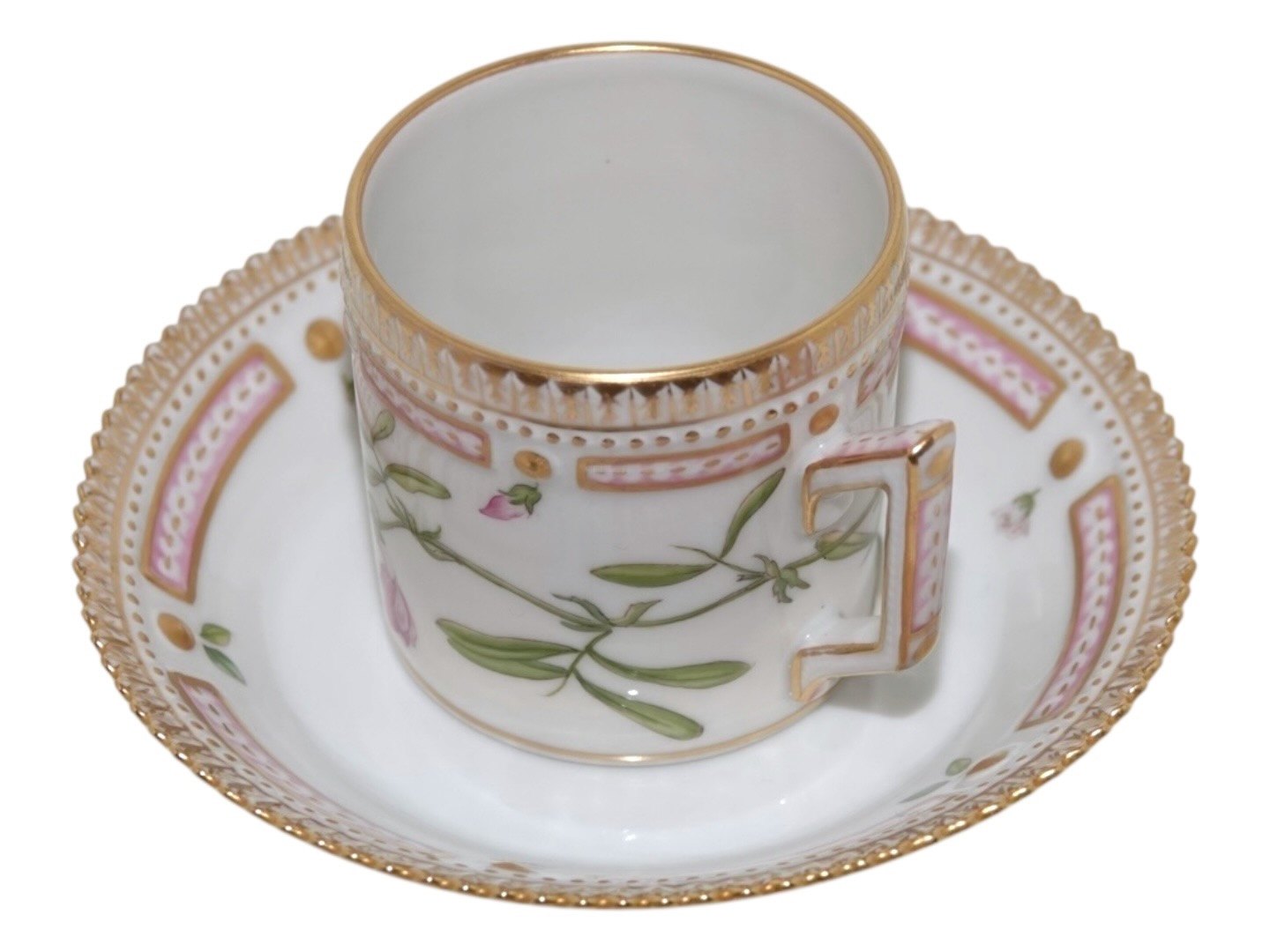 Royal Copenhagen Flora Danica, lille tøndeformet espressokop med tilhørende underkop.