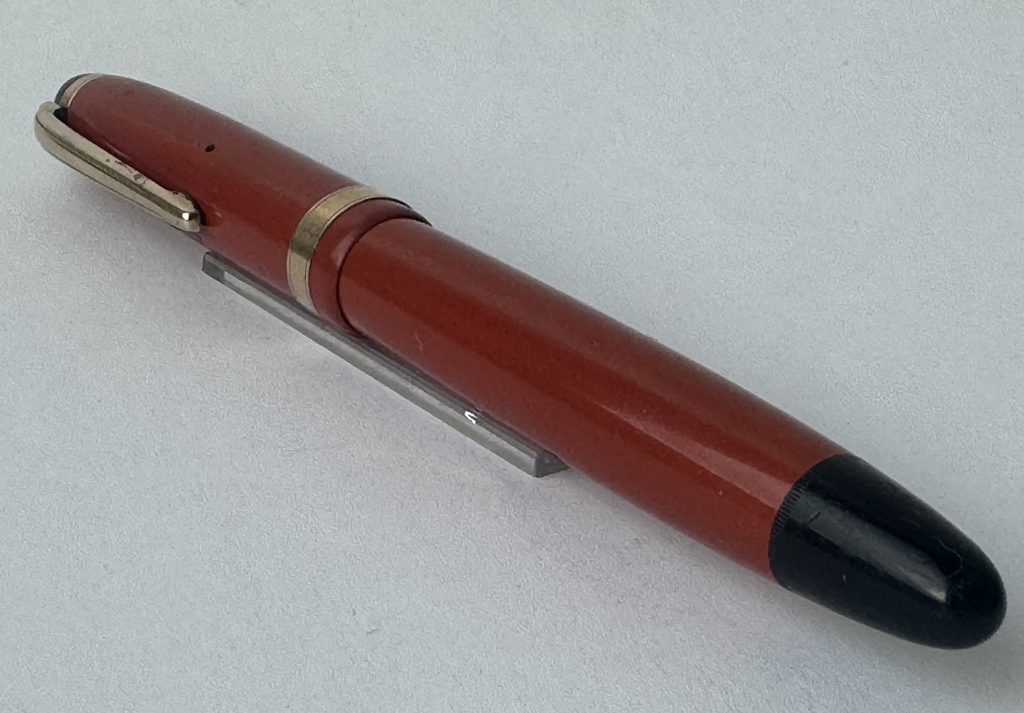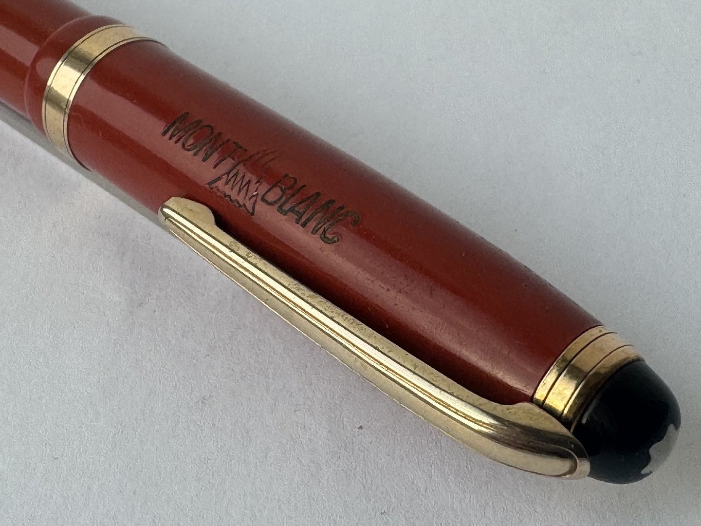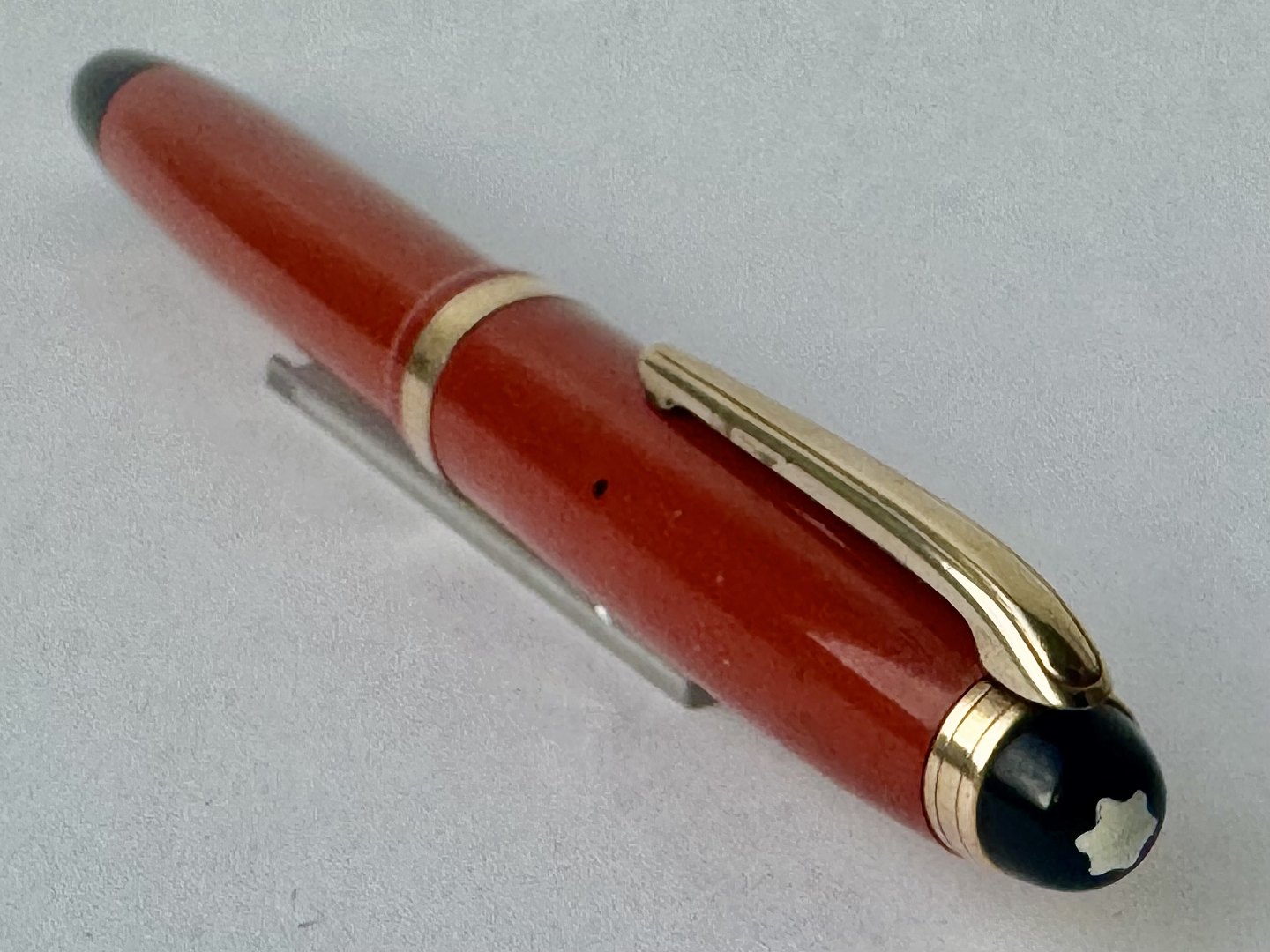 Koralrød Montblanc no. 212 fyldepen. Fremstår i god stand uden skader eller reparationer. Hætten mærket med MONTBLANC den lille sorte bundskrue med modelnummeret 212. Der skal indsættes en ny gummisæk, før end den igen kan optage blæk og skrive påny.