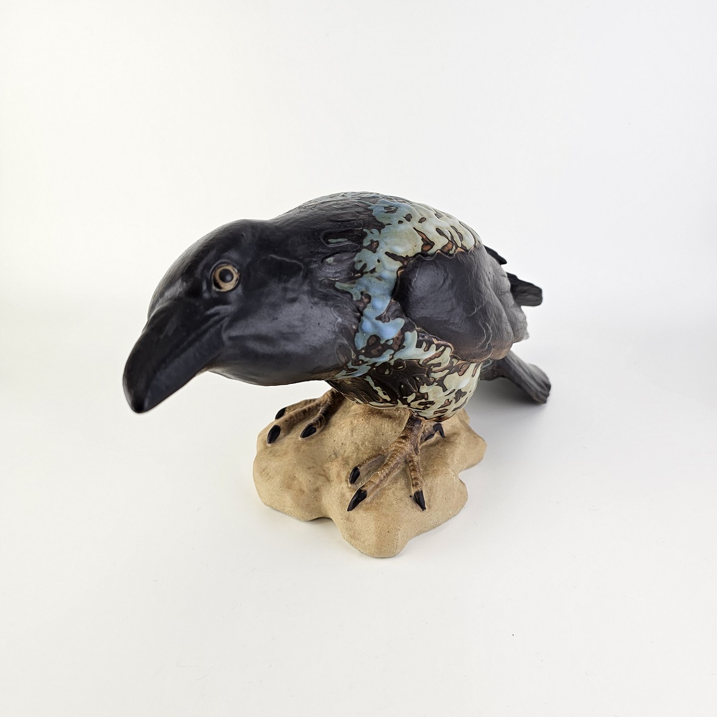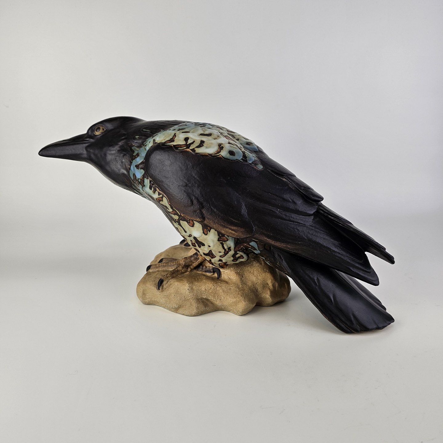 Figur i stentøj med motiv af en krage på en sten