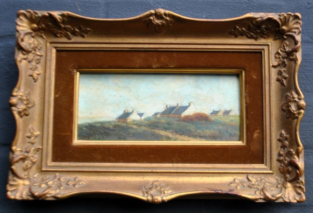 Deschamps, Margaret (19. år.) Frankrig: Huse ved havet. Olie på træ. Signeret. 9 x 21 cm.