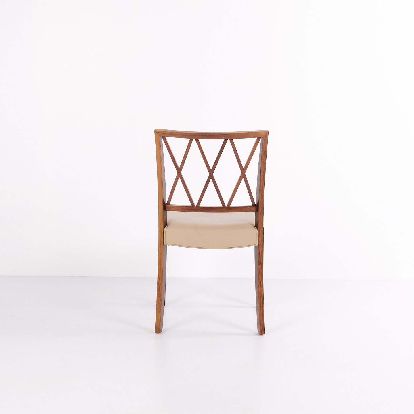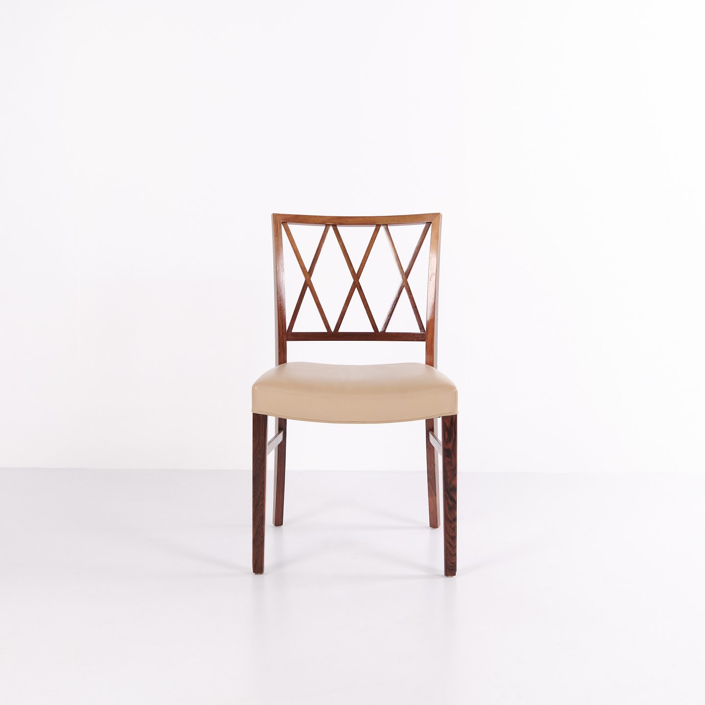 Sæt af fire spisebordsstole af Ole Wanscher for A.J. Iversen. Palisander og cremefarvet læder. Dansk design fra 1960’erne.